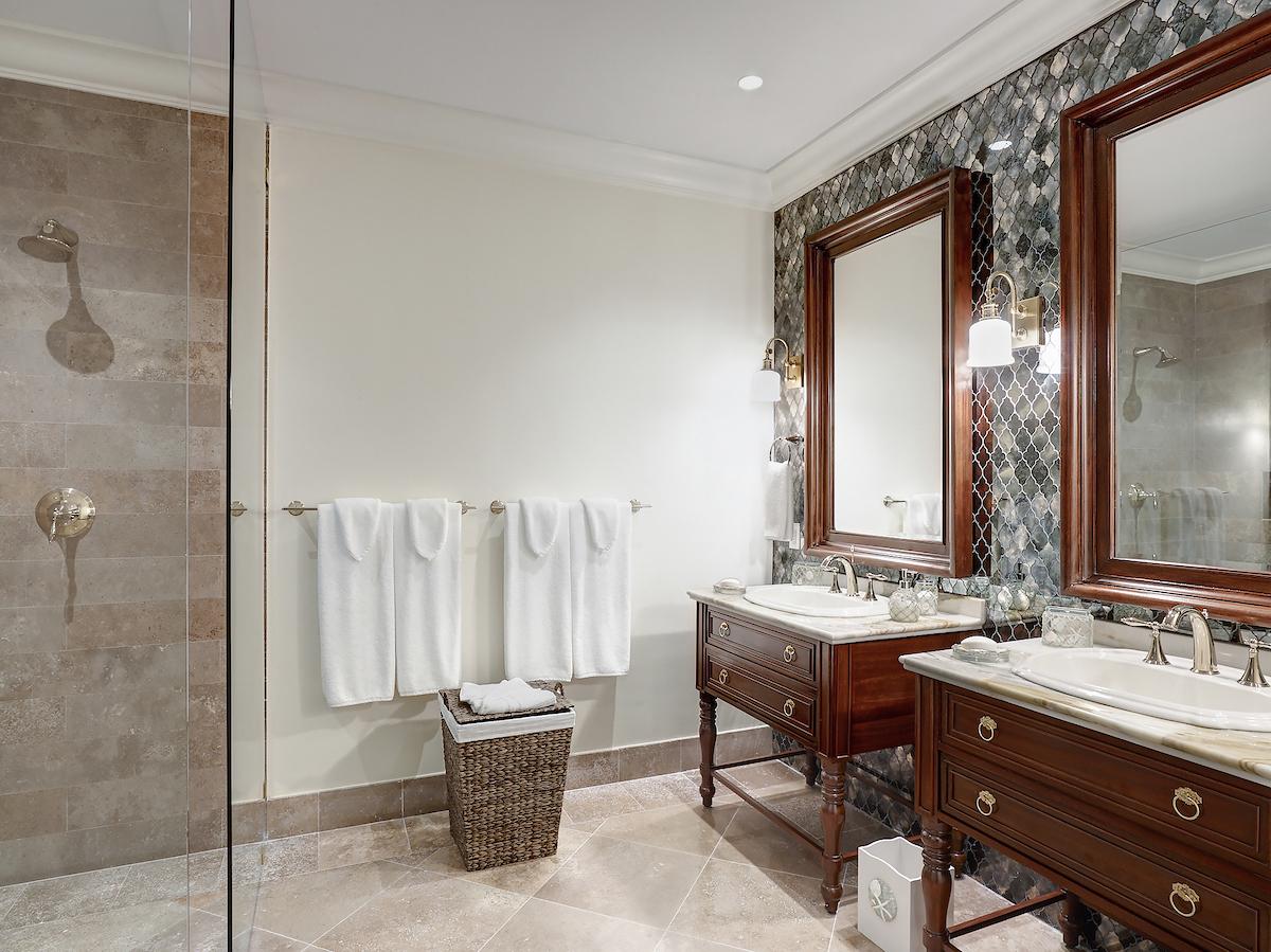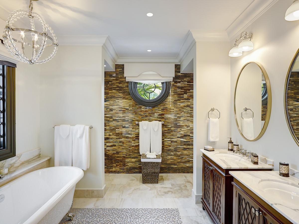 Primary Bedroom: This room is equipped with a king-sized bed, a ceiling fan, private access to the pool area, a walk-in closet, and an ensuite bathroom with a shower and dual vanity.