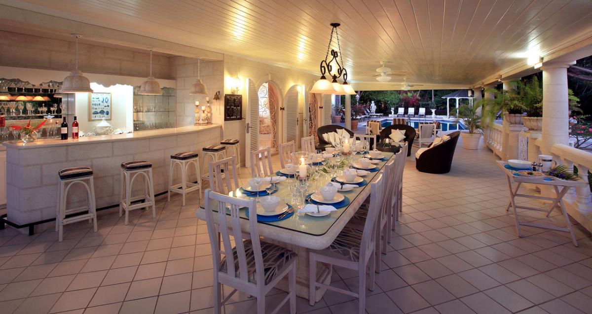 The indoor living room features oversized comfortable sofas and French doors that open out on to a covered terrace with casual outdoor seating, wet bar and a large dining table that seats 12, so everyone can gather together and enjoy quality time.