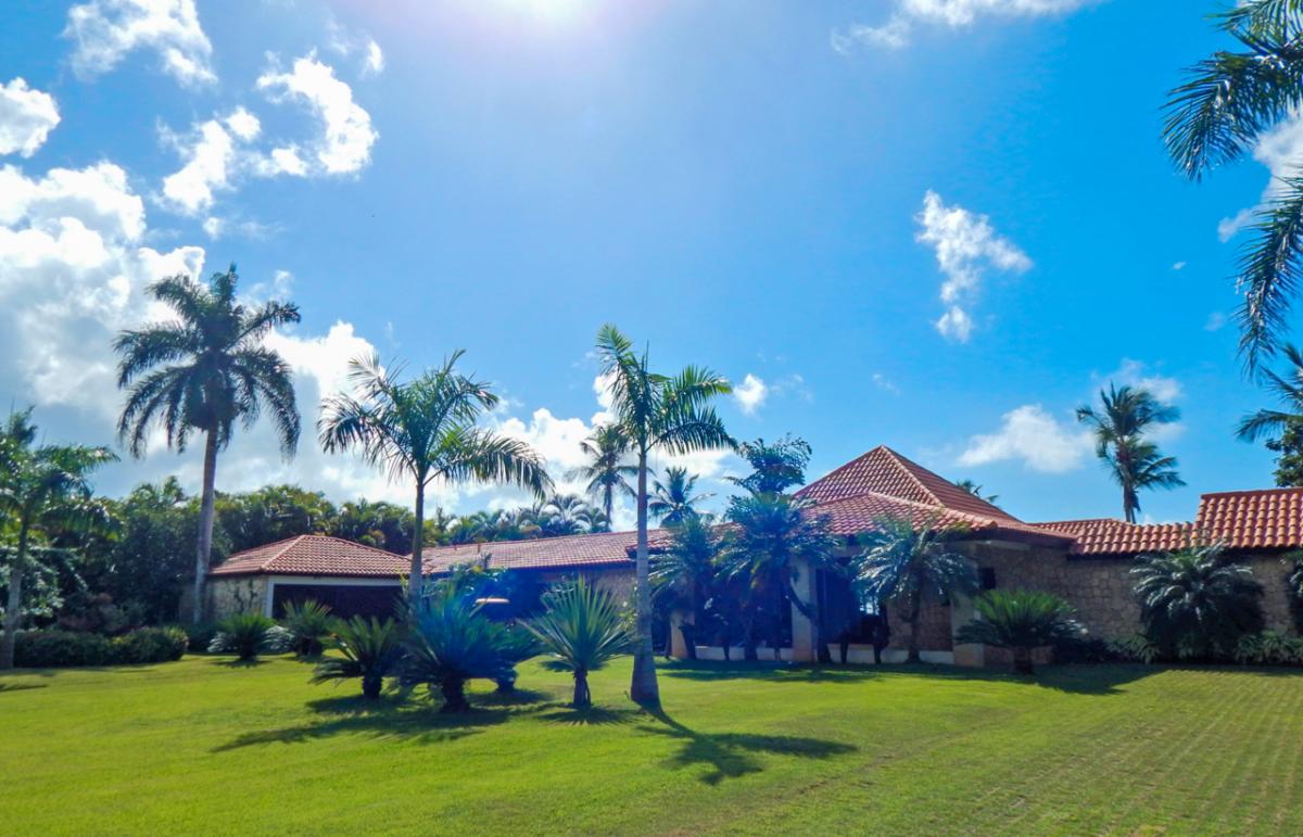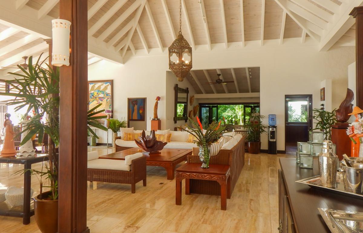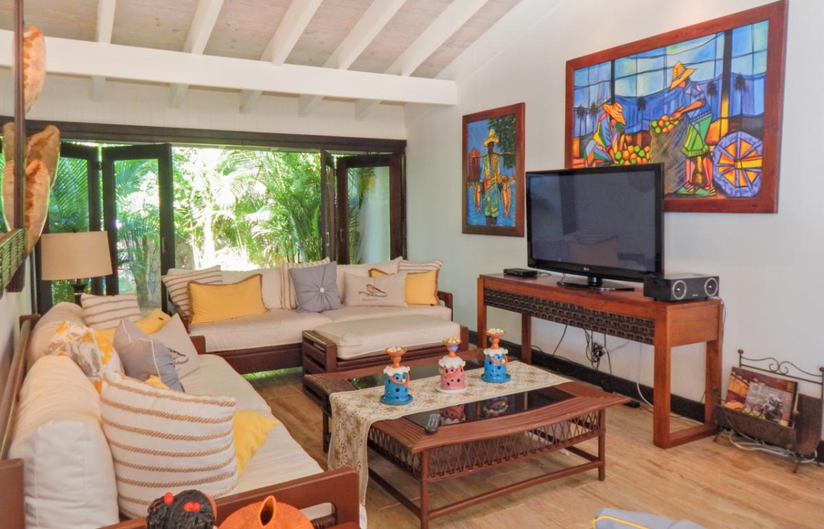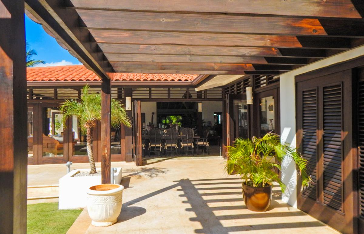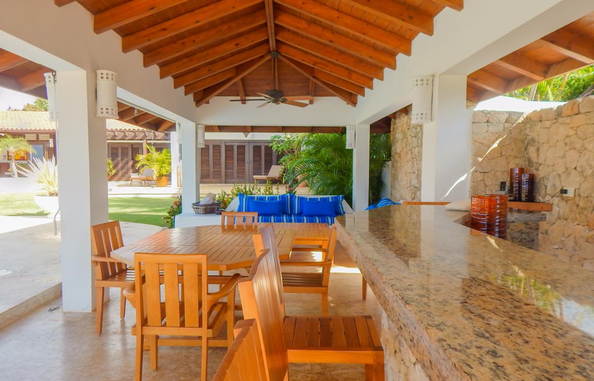 Full of style and comfort, this one-story villa features a large figure-eight shaped pool that sits right in the center of the action. A sandstone terrace, dotted with loungers, connects to a furnished gazebo where ample seating, and a dining table for eight can be found. A quick golf cart ride will bring you to the hotel as well as many of the other resort amenities Casa de Campo has to oer.