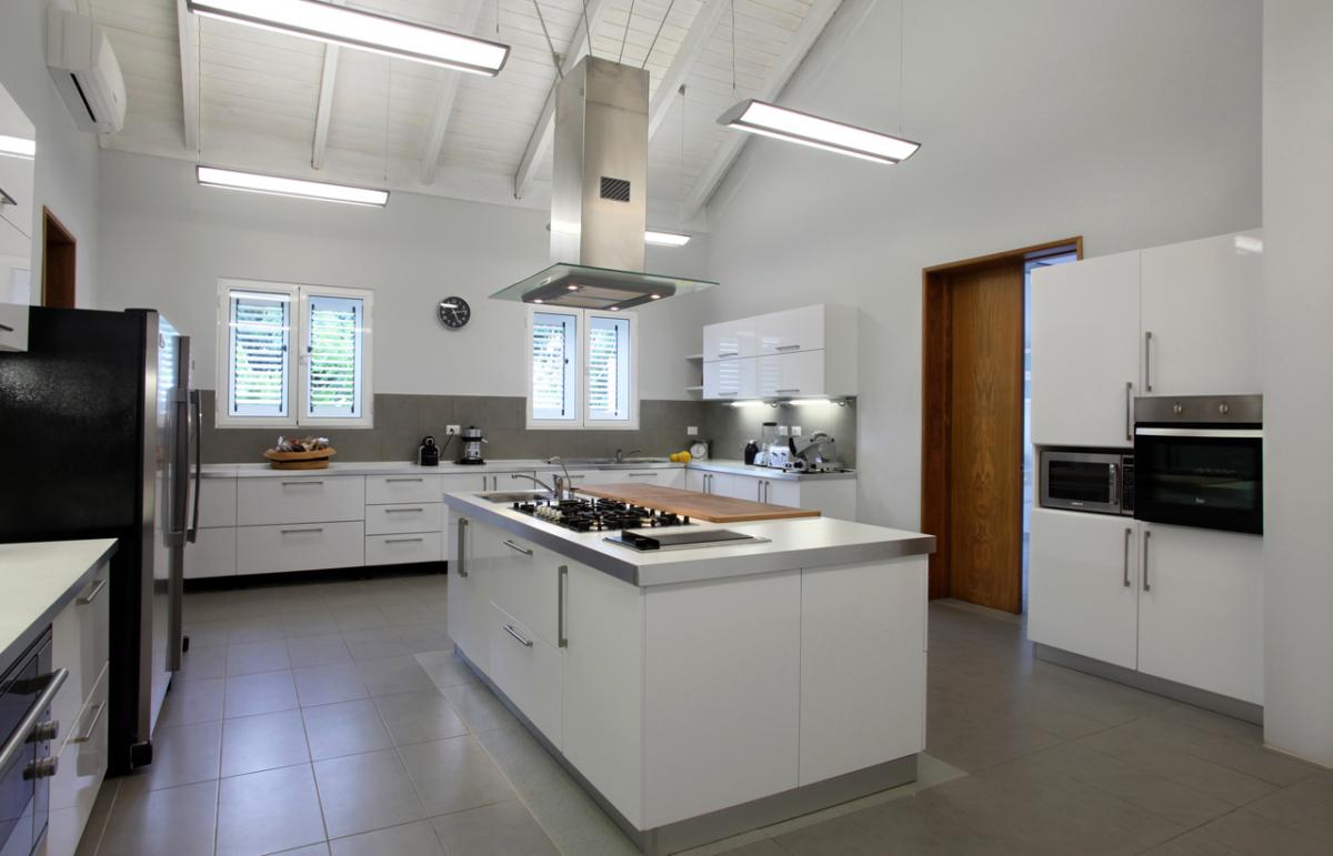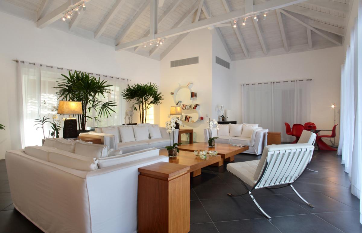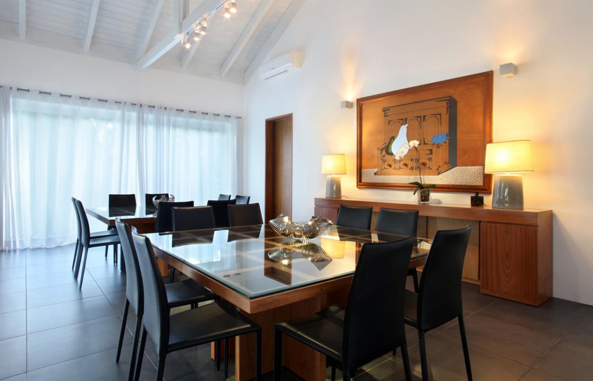 Entering the completely air-conditioned interiors, guests find an array of versatile settings for vacation living and entertaining; each realized with impeccable quality and style. In the formal living room, plump white sofas and loveseats contrast with teak tables while well-chosen accessories add character and color. A table in one corner is perfect for snacks or games. The family room includes a large-screen plasma television and a long couch to kick back and enjoy sports or keep up with the news. The formal dining room features two side-by-side square tables, each seating eight. In the professional-level kitchen, a center island with cook top, separate oven, and double refrigerator are among the many highlights.