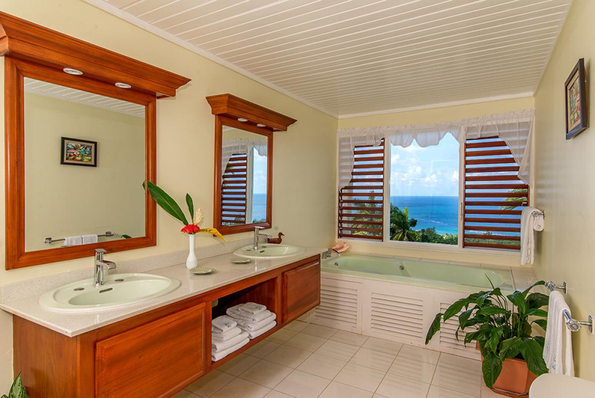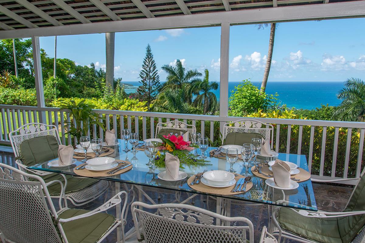 On the main floor, wide glass doors and cedar louvres open to the wrap-around verandah. The perspective is mesmerizing day and night ... sunrises and sunsets, cruise ships, tropical lightning shows on the distant horizon, and the twinkling night lights of the town across Montego Bay.