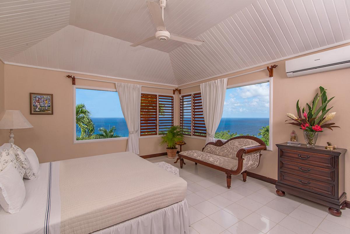 Upstairs is the bright master bedroom suite, commanding a stunning view of the tranquil harbor of Montego Bay and the lush mountains beyond.