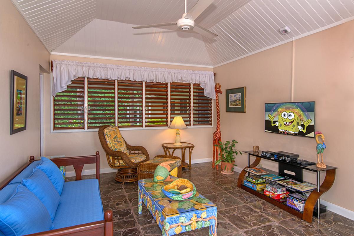 The pretty living room has extraordinarily comfortable overstuffed sofas and chairs and a hand-painted armoire which houses a television and VCR. Adjoining the living room is the colorful den, also with television and VCR and games cupboard ... an ideal playroom for children. A daybed in the den can accommodate one extra child. Twin-size air mattresses are available as well. Just outside the den is a removable gate should parents wish to control access of children to the pool area.