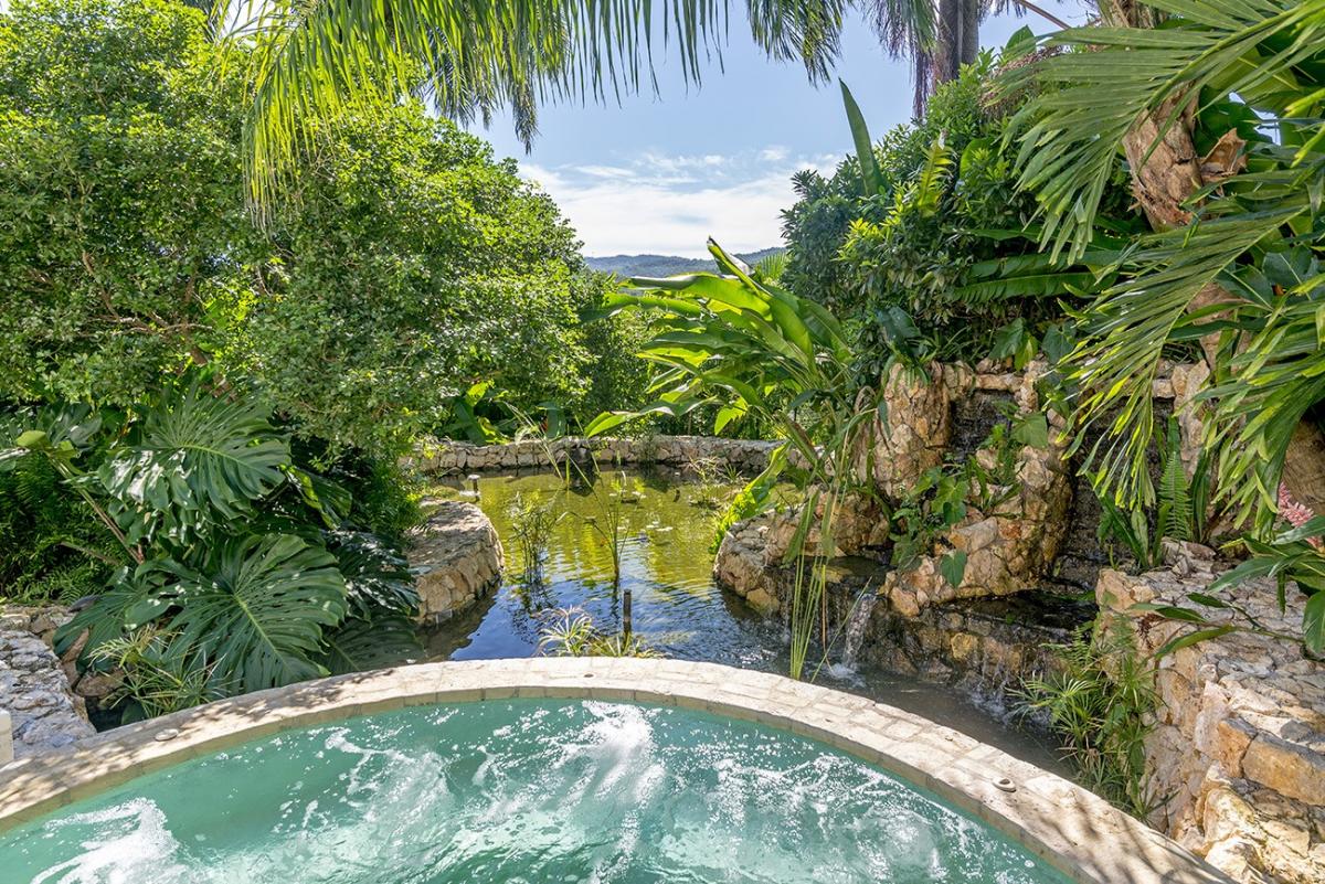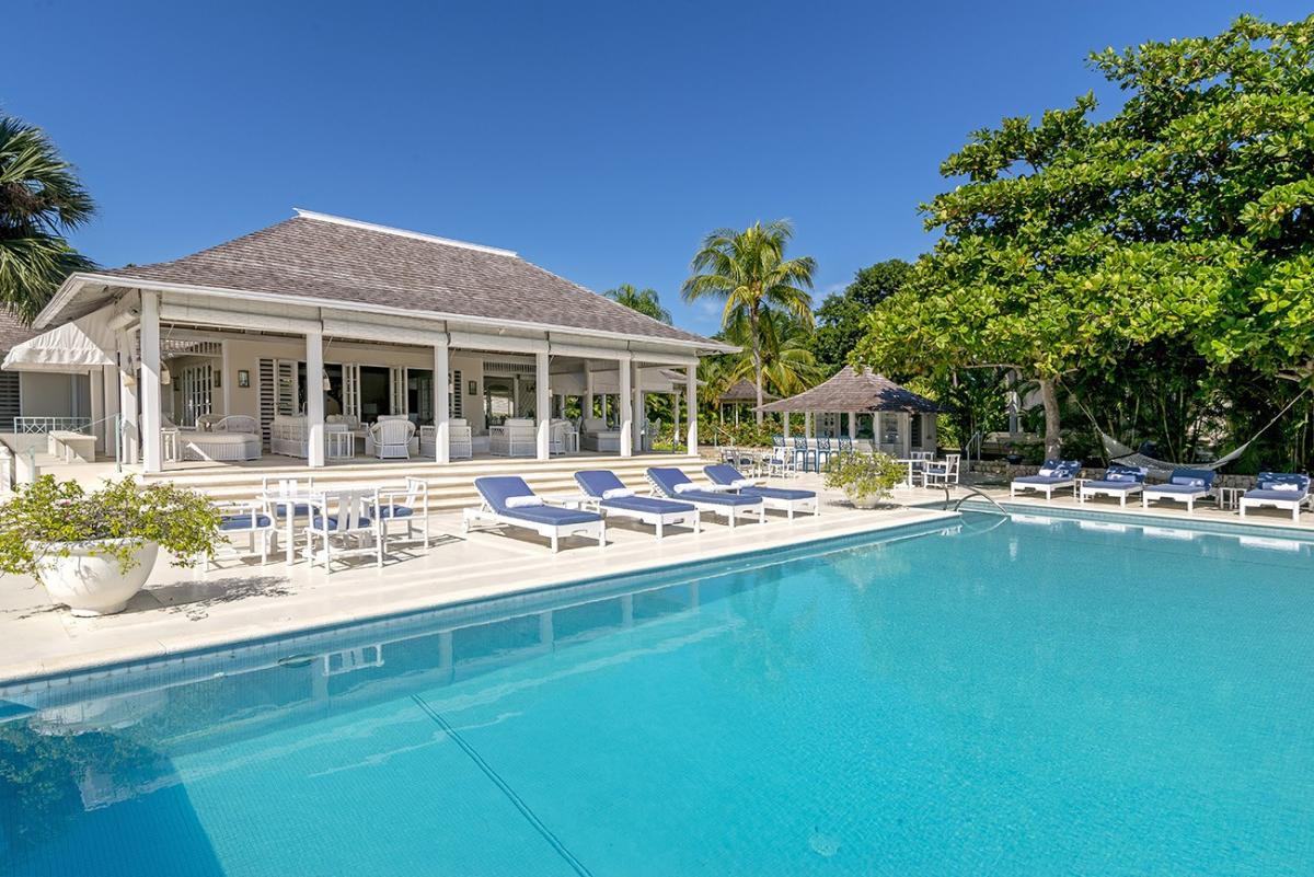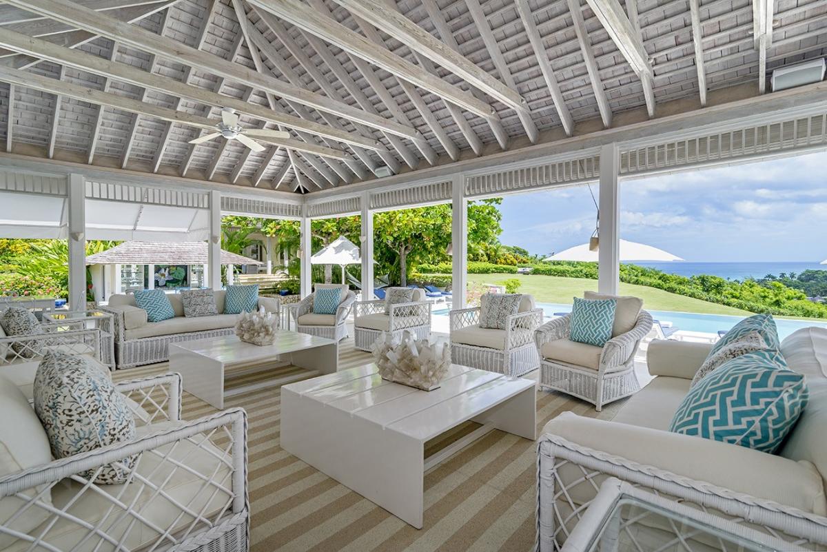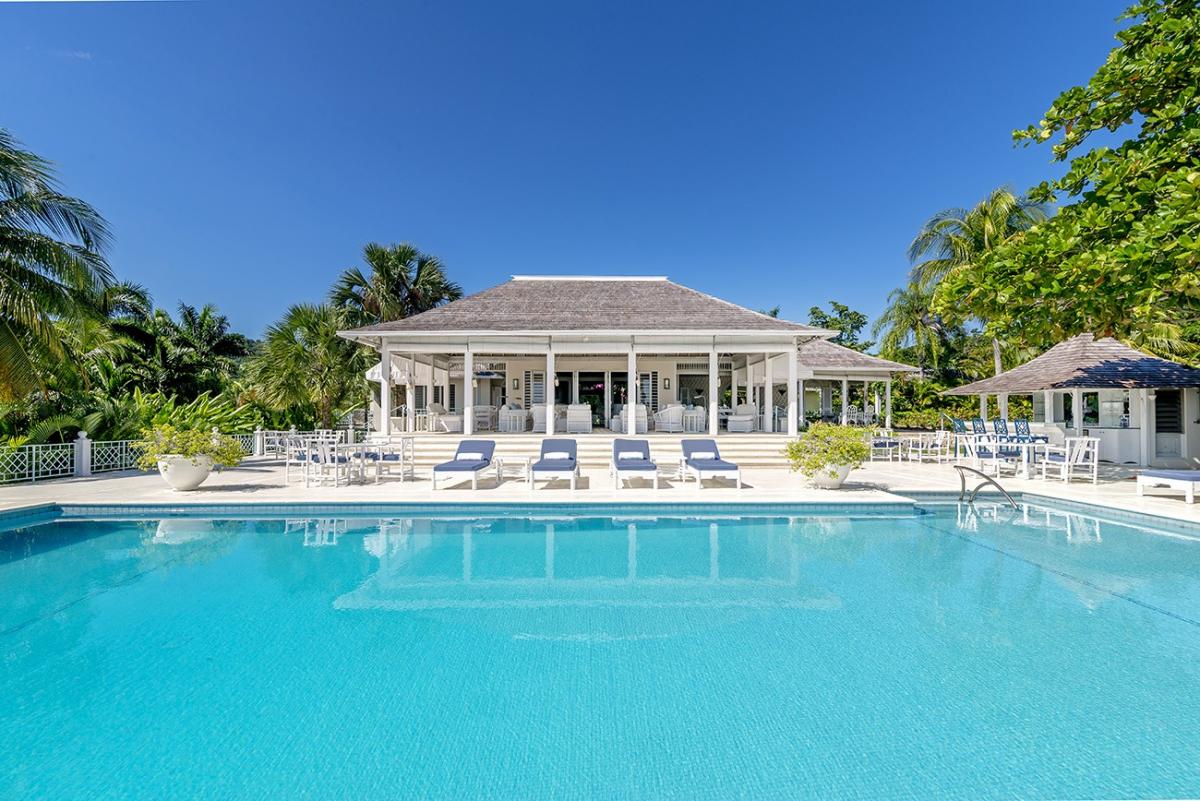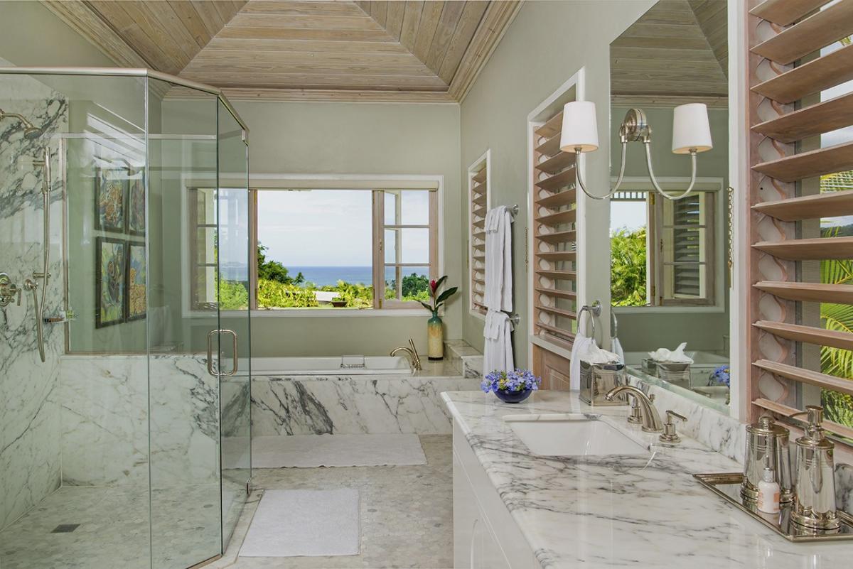 From the Great Room, 18 French doors open to 1,400 square feet of furnished verandahs. Deep cushions cover sofas, chairs, chaises and a wonderful bamboo swing. The view is spectacular day and night. Just beyond the verandah, the private pool spans the front of the house. Adjacent to the pool are the outdoor wet bar and shower and the cutest little powder room in Jamaica.