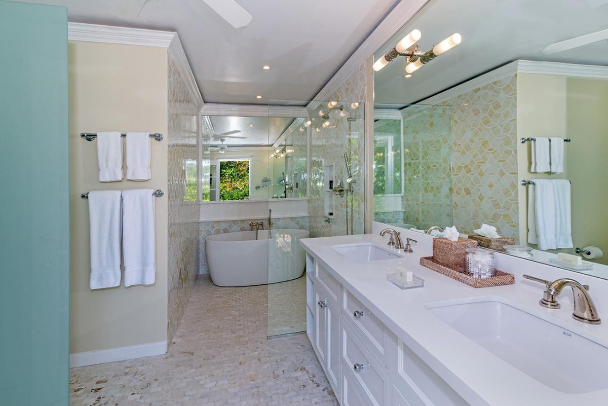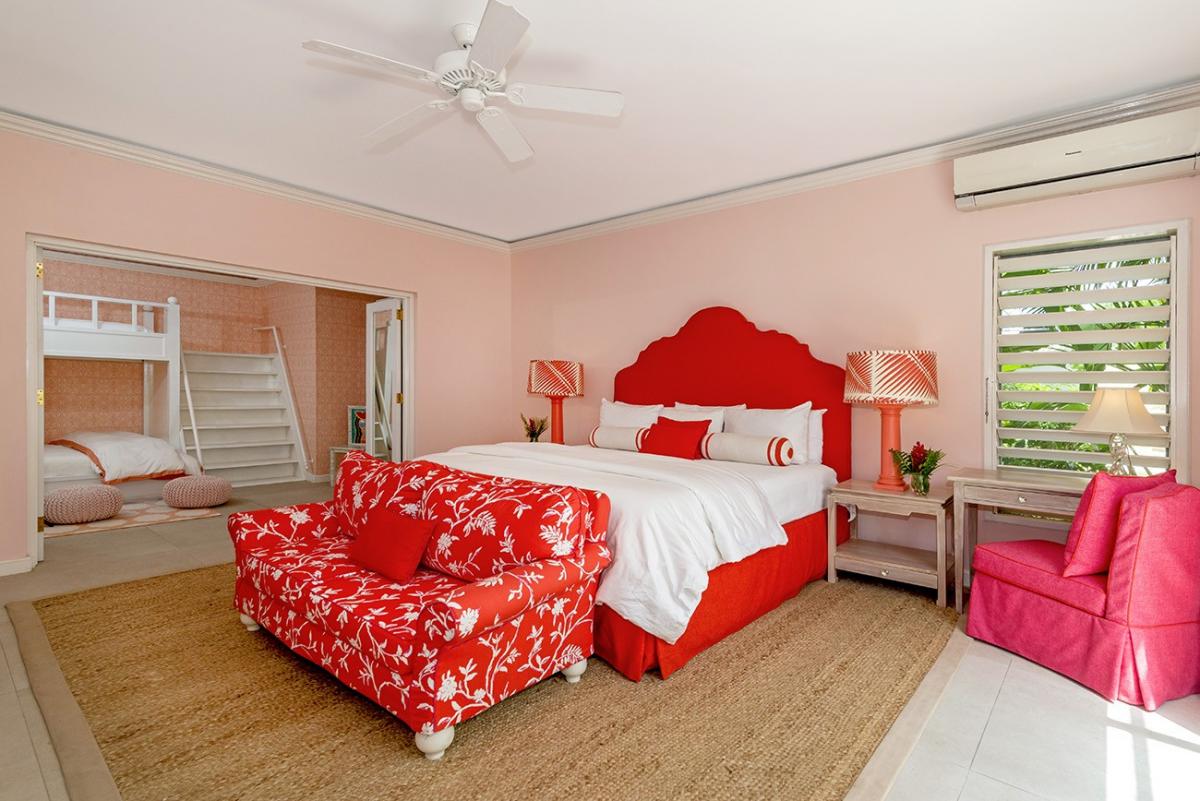 - Bedroom 5: Primary with king bed, en suite bathroom with glass shower, mirrored armoire, inside and outside sitting areas, AC