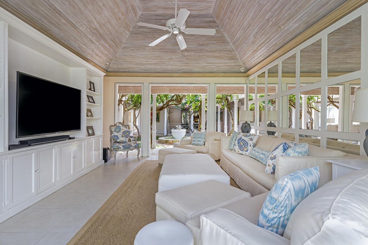 The very comfy Family Room opens on two sides to the atrium and garden. A 52'' television on Direct TV system provides 950 channels (movies, HBO, free Pay Per View, sports, etc.), sound system, and library of books and movies invite days and evenings of entertainment. A few steps away are the powder room, second wet bar and fridge stocked with soft drinks and juices.