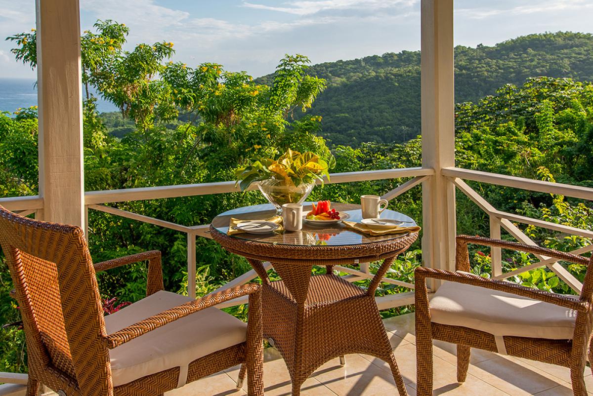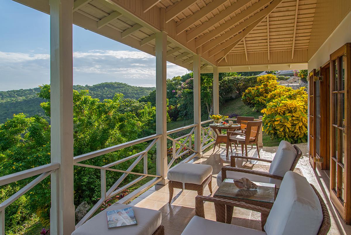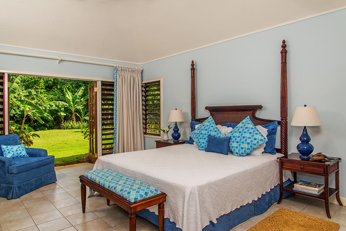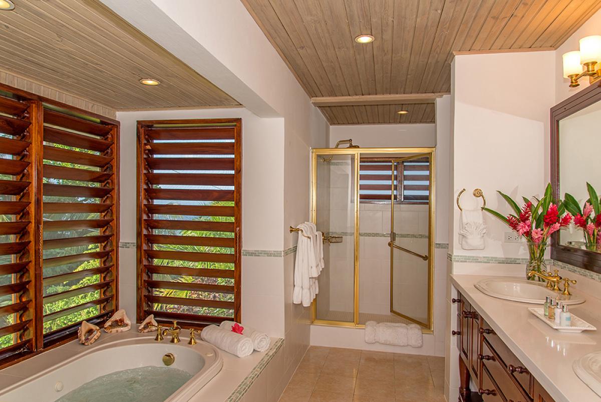 Bedroom 5: King bed, covered porch, hillside and ocean view, large en suite bathroom with jacuzzi tub and glass-walled walk-in shower