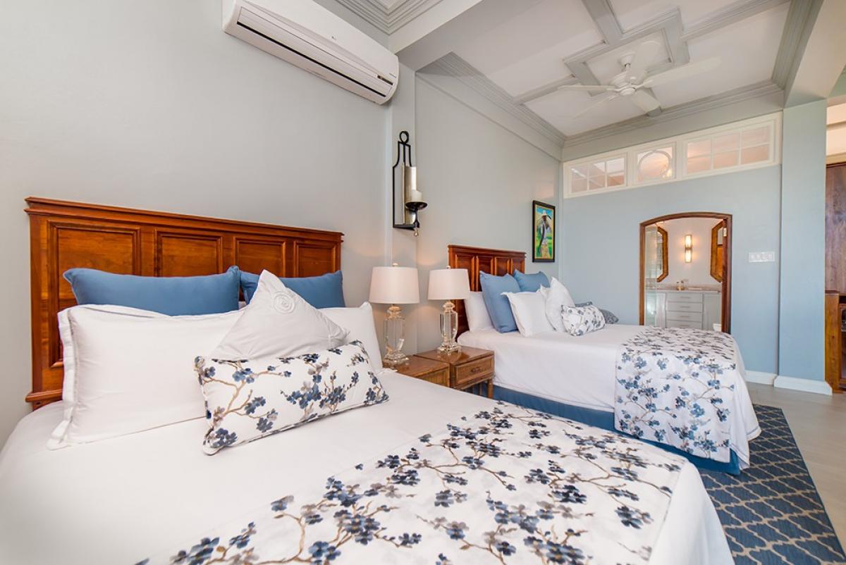 Bedroom 7: This room is located downstairs. Bedroom 7 is equipped with two queen-sized beds, a sitting room with a balcony, and an ensuite bathroom.