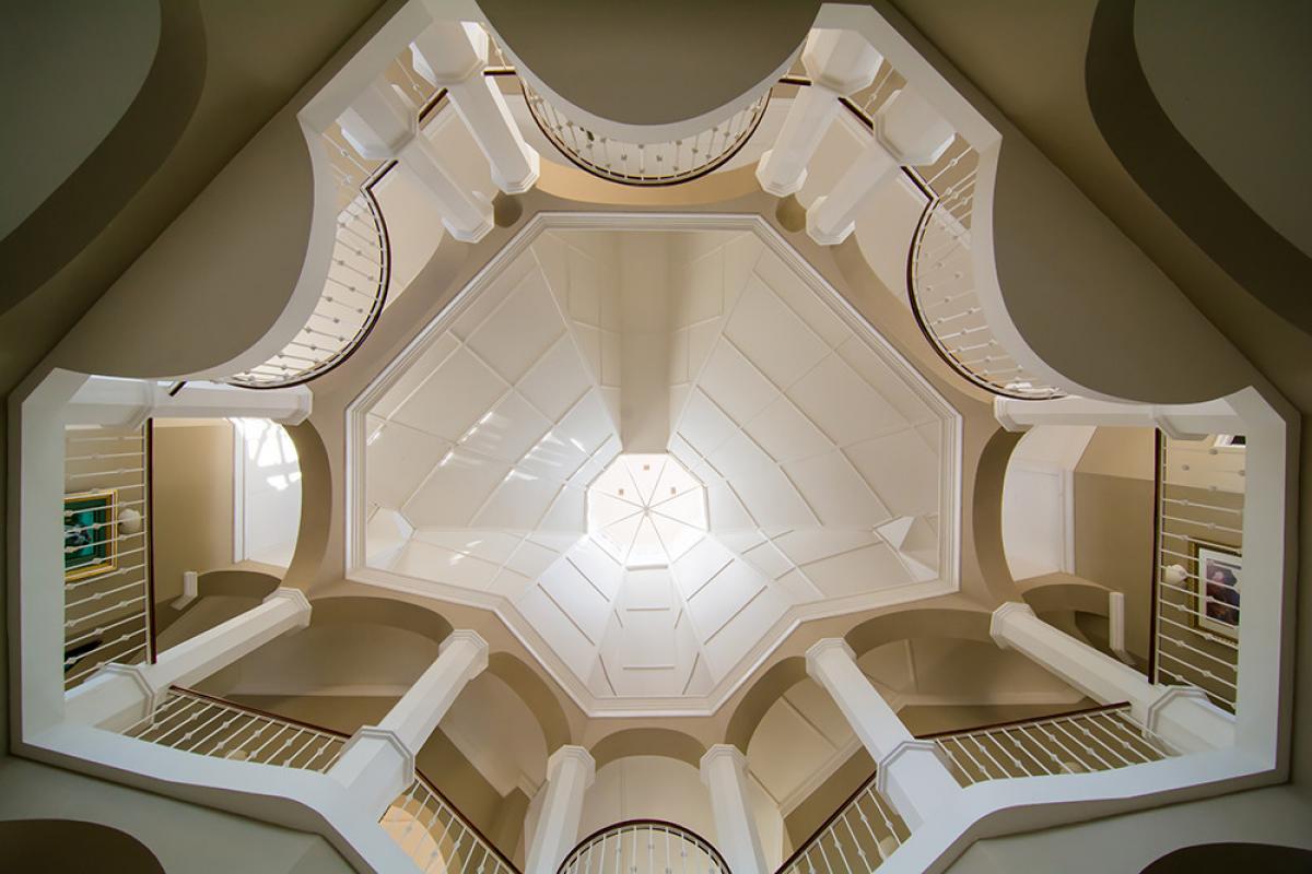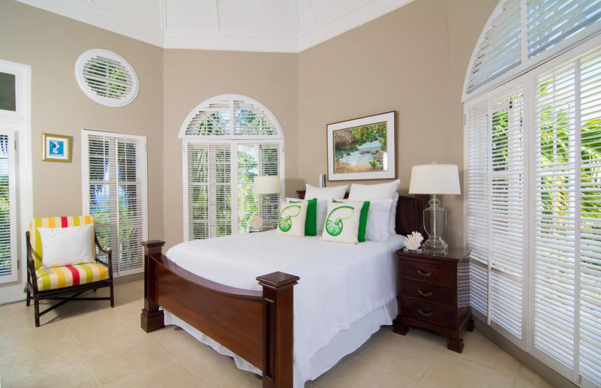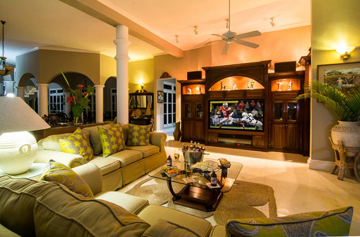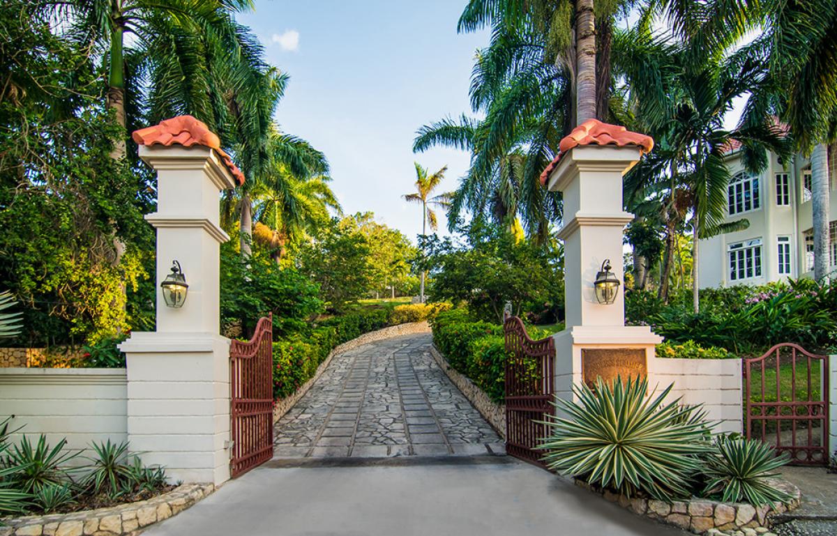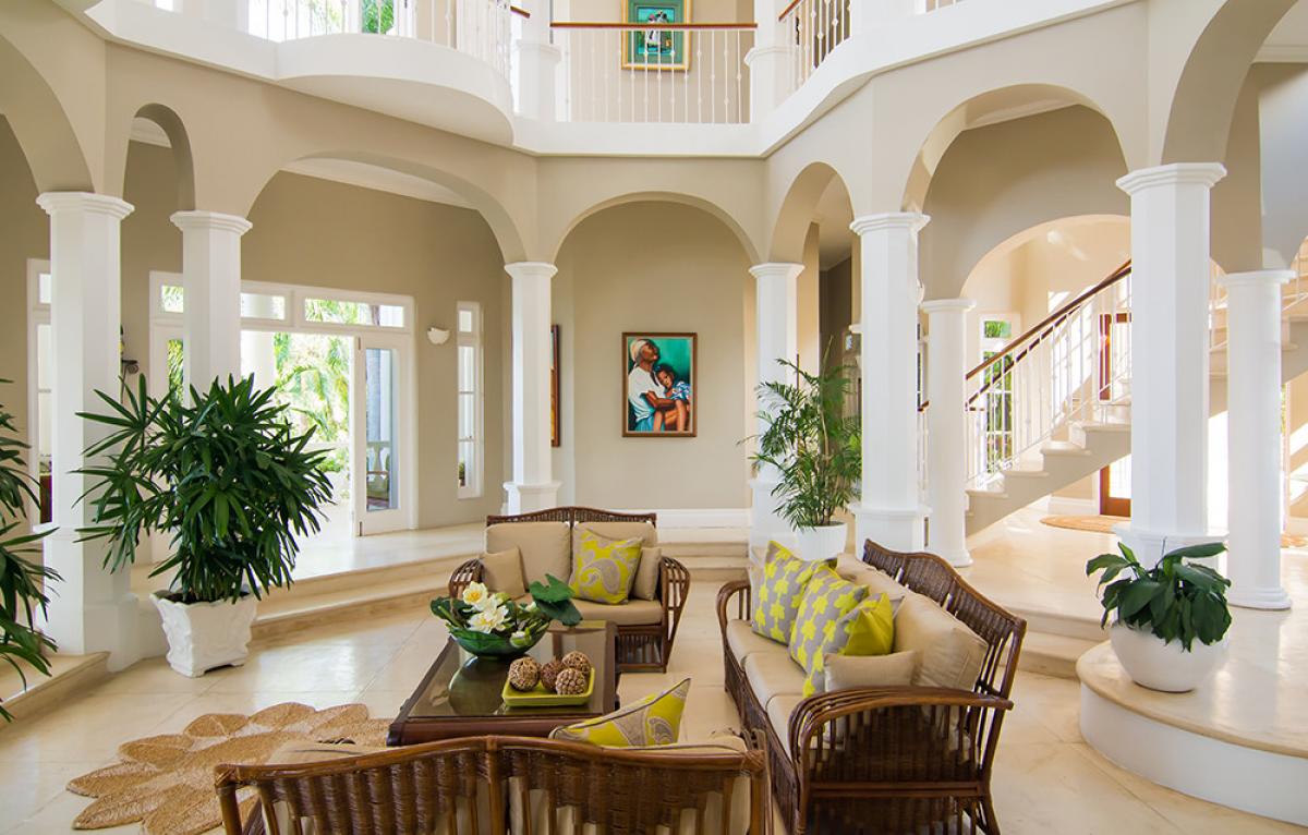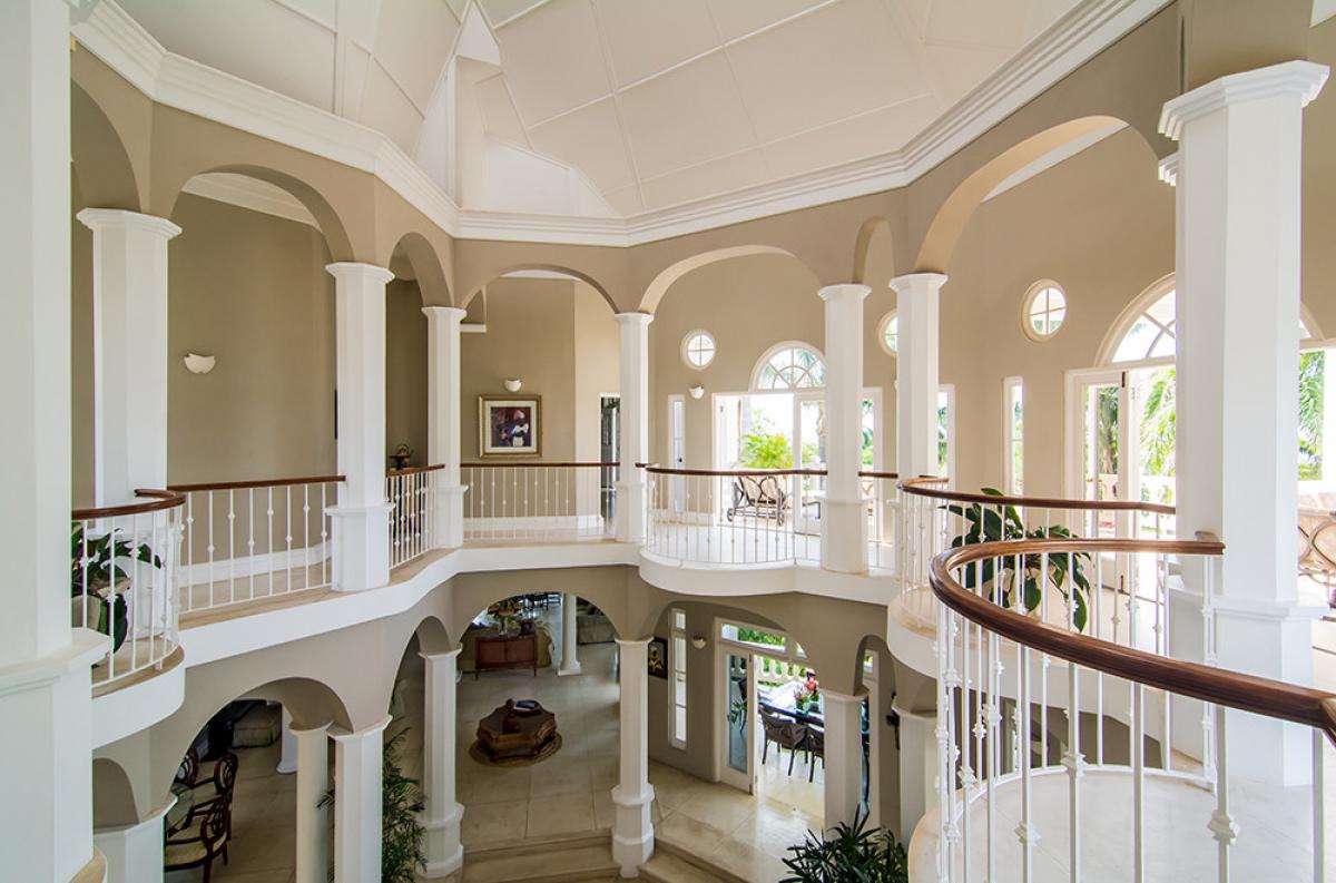 Endless Summer is a turreted mansion with views of the Caribbean Sea. From the porte-cochere, beveled glass doors open to a dramatic 80' columned space. A sweeping white stone staircase curves gracefully from the foyer to a balustraded gallery encircling and overlooking the sunken living room ... topped high above by the dome of this home's highest turret. From the gallery, as from all bedrooms, a wall of glass doors opens to the deep wrap-around porch and panoramic vistas over the golf course and the turquoise waters outlining the horizon.