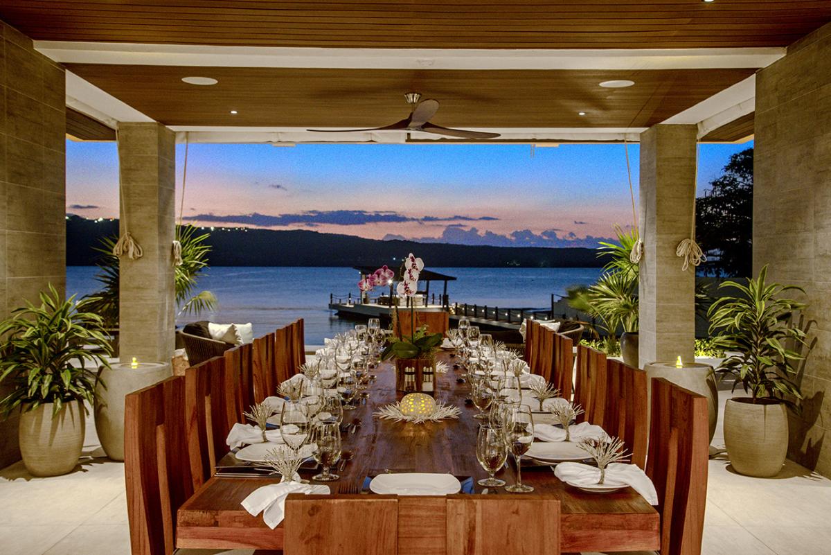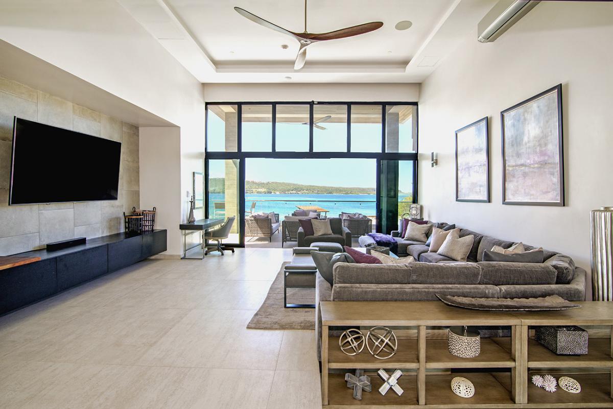 When entering the villa, there is a double-height entrance hall that leads into the main indoor and outdoor living areas. There is a formal dining room with a wall of windows to the left, while to the right, there is a comfortable sitting room with soft, deep leather sofas. To get onto the outdoor terrace with more dining space, seating, a large bar with a TV, and a cappuccino/espresso station, guests have to walk through one of the three 25ft doors. This covered terrace leads to an infinity pool, an outdoor kitchen, a gazebo overlooks a pool, a hot tub, and a grassy lawn. Happy Hour has many outdoor areas for guests to enjoy each other and the surrounding views.