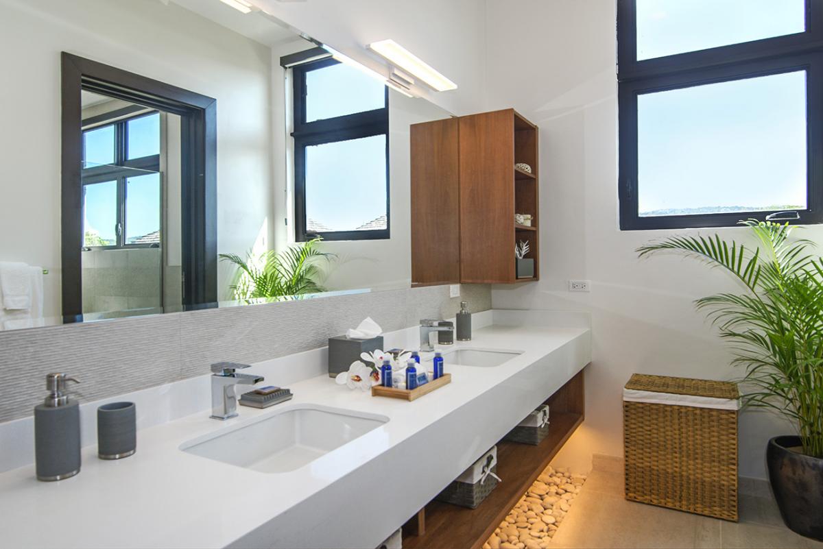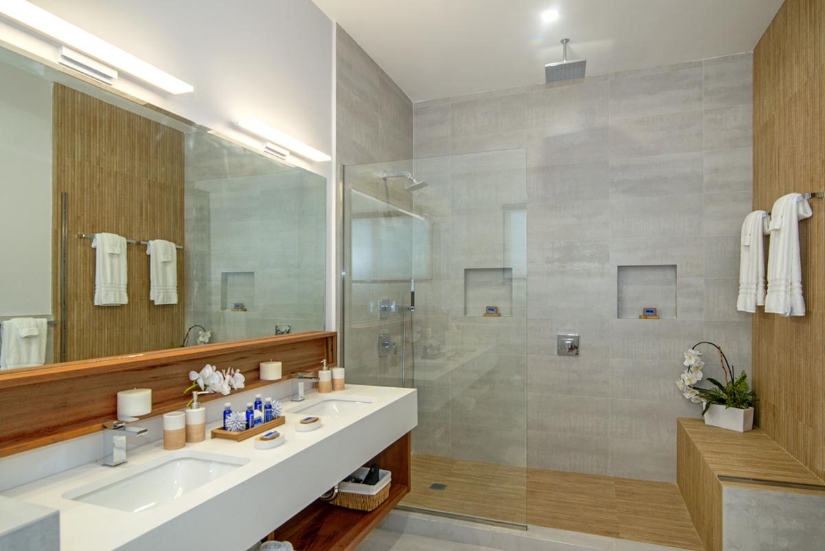 Bedroom 2: This room is located on the lower level and it has a king-sized bed, remote-controlled air conditioning, a ceiling fan, a flat-screen TV, a personal safe, and a walk-in closet. This room also has an en-suite bathroom equipped with a walk-in rain shower, and double vanities. A veranda that is facing the ocean is also included.