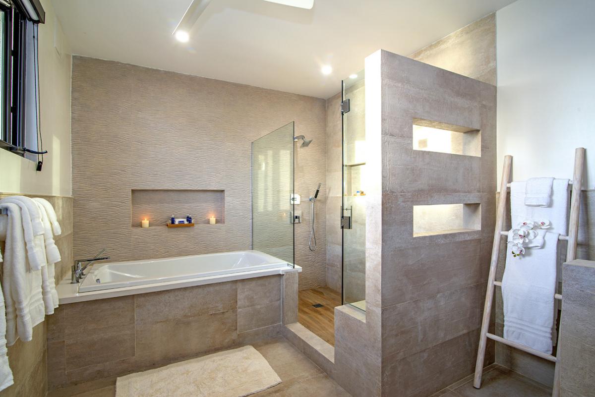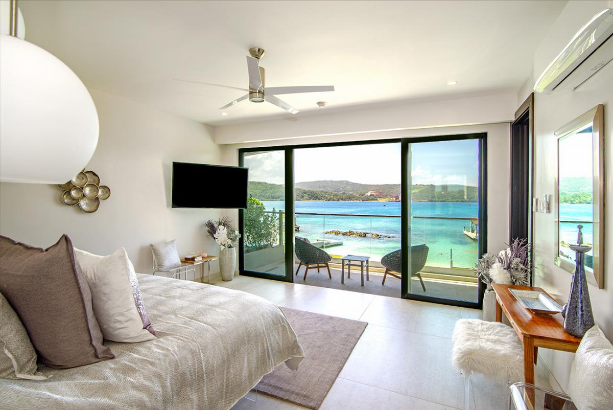 Primary Bedroom 1: This room is located on the lower level and has a king-sized bed, remote-controlled air conditioning, a ceiling fan, a flat-screen TV, a personal safe, and a walk-in closet. The room also has an en-suite bathroom equipped with a jacuzzi tub, a walk-in rain shower, a double vanity, toilet, and bidet. A veranda that faces the ocean is also included.