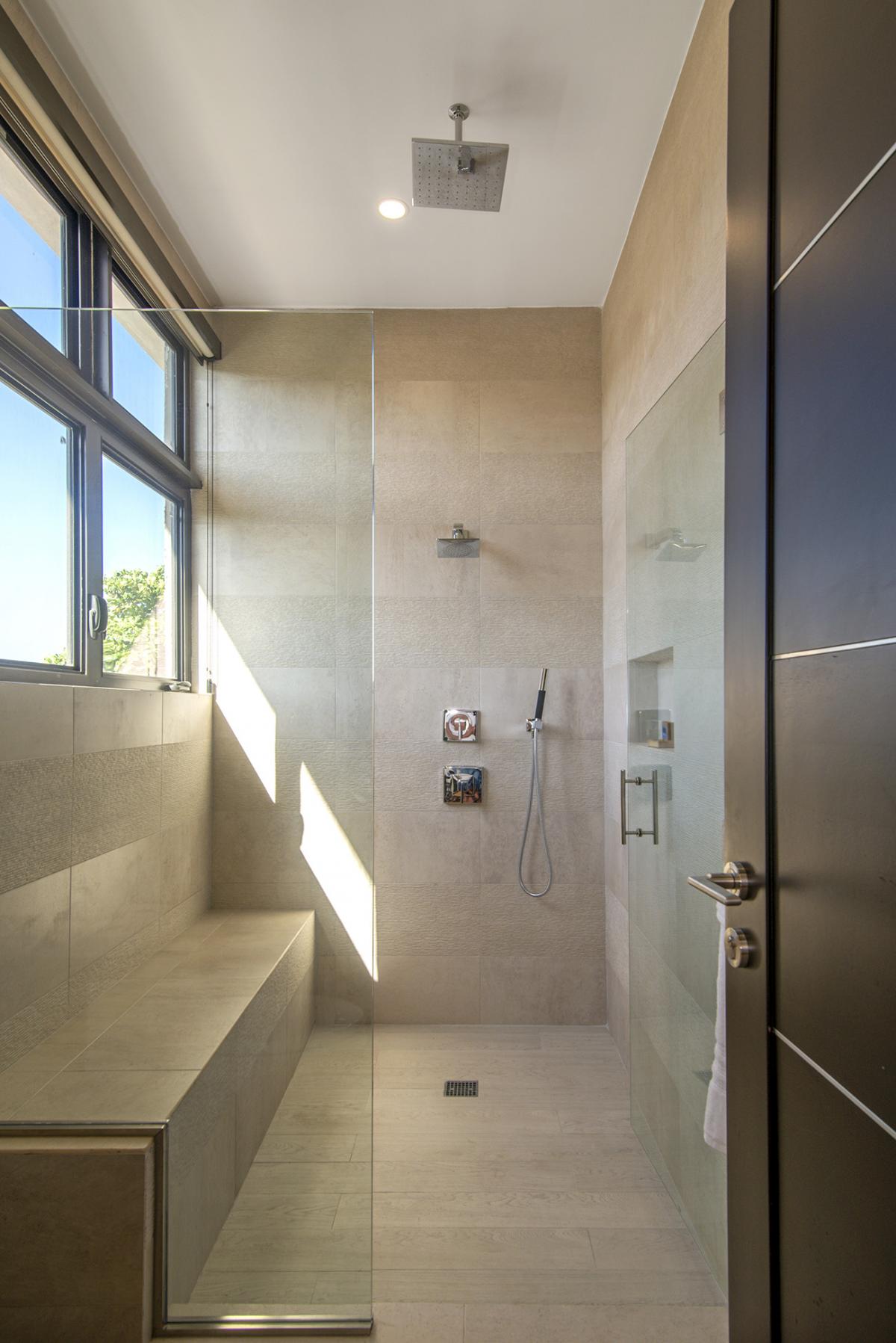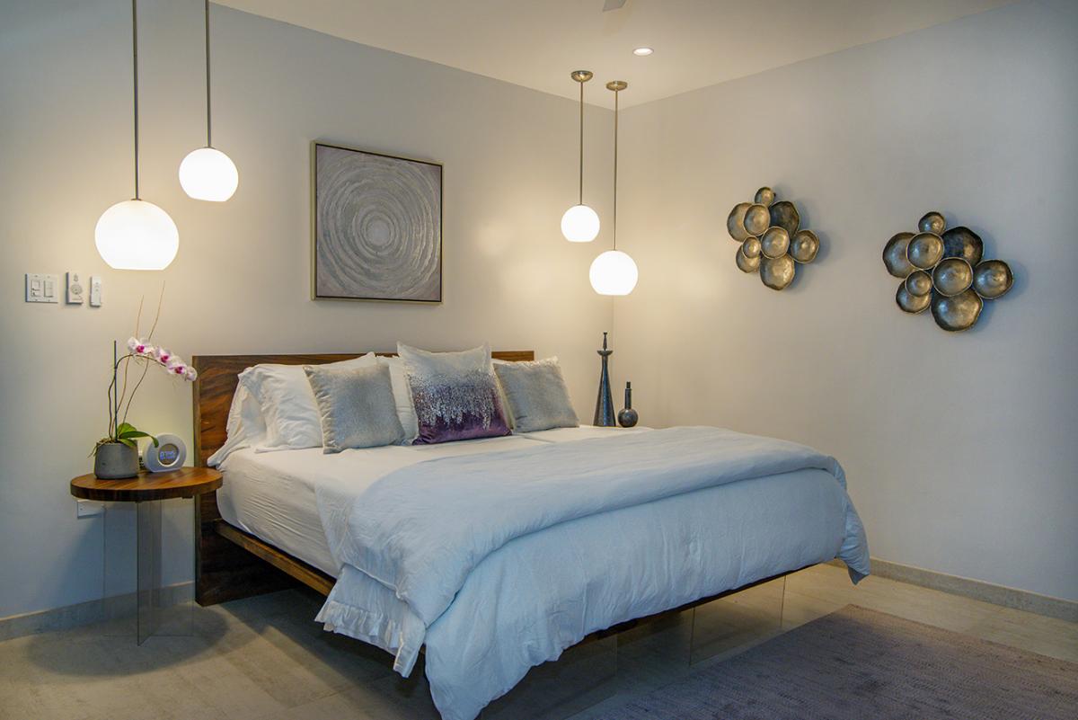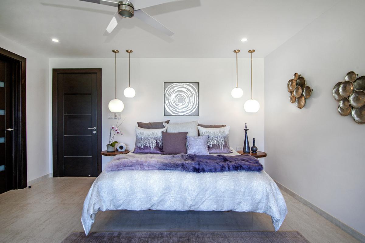 Bedroom 4: This room is located on the upper level and has a king-sized bed, remote-controlled air conditioning, a ceiling fan, a flat-screen TV, a personal safe, and a walk-in closet. The room also has an en-suite bathroom equipped with a walk-in rain shower, a double vanity, a toilet, and a bidet. A balcony that faces the ocean is also included.