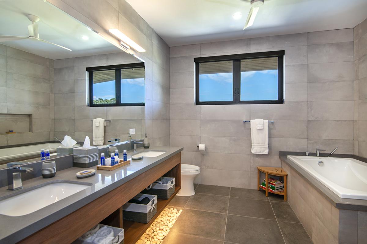 Bedroom 5: This room is located on the upper level and has a king-sized bed, remote-controlled air conditioning, a ceiling fan, a flat-screen TV, a personal safe, and a walk-in closet. The room also has an ensuite bathroom equipped with a separate soaking tub, an over size walk-in rain shower, a double vanity, a toilet, and a bidet. A balcony that faces the ocean is also included.