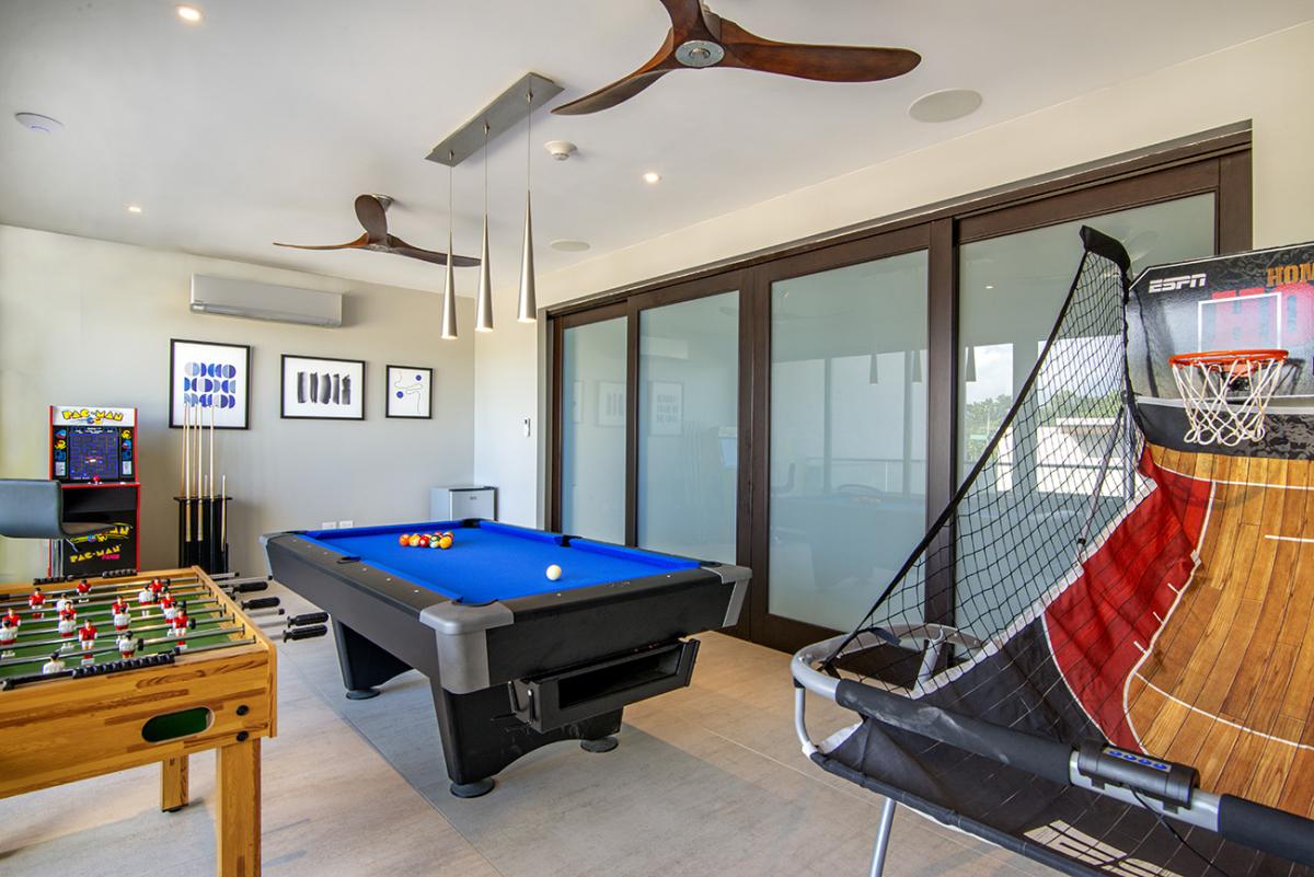 The main level of Happy Hour has a professional kitchen, where the chef and pastry chef prepare incredible meals for guests. There are also two bedrooms on this floor, one of which is one of the master suites and steam and sauna room. Both bedrooms on this level have an over-water private terrace that provides access to the main outdoor living areas. The upper level has five bedrooms. The massage/spa room with a garden-facing balcony, a media room equipped with a 96 inch TV and its own entertaining balcony, and a game room equipped with a pool table, arcade basketball, Pacman, and a foosball table.