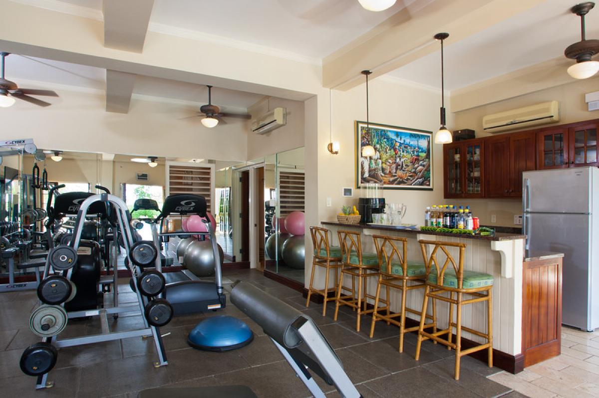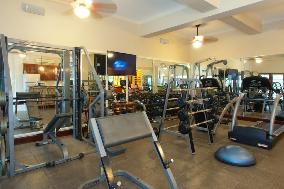 Just a few steps from the pool is the expansive fitness room, well equipped with body-building equipment, TV, drinks bar and fridge.