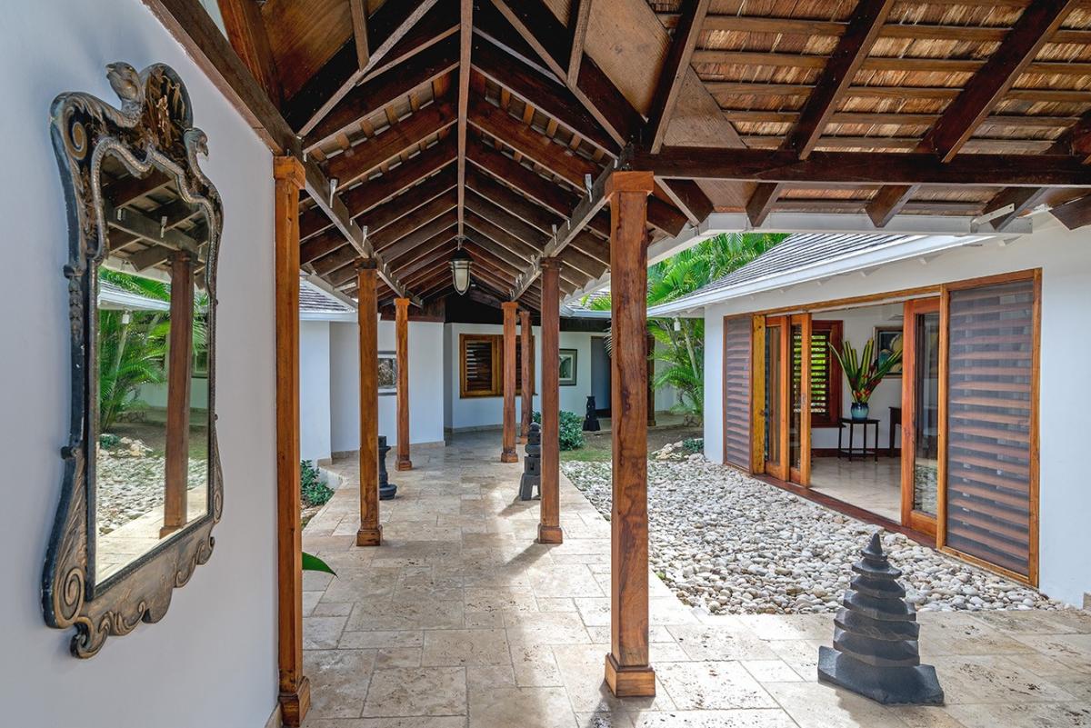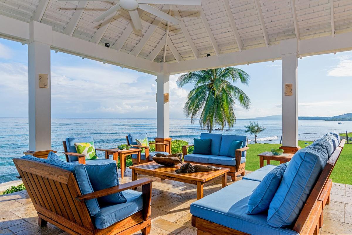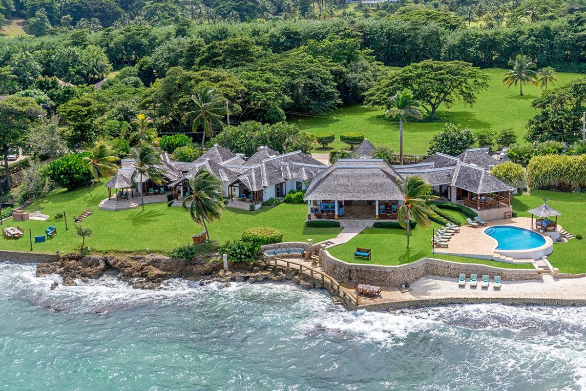 A sprawling double lot directly on the Caribbean Sea is among the most stunning waterfront locations in all Jamaica. This is the rarefied site of the private villa named Karma Bay. Six bedrooms, multiple gazebos and sitting areas, and a beautiful pool with a broad marble terrace are bordered by a wide soft lawn, coconut palms and a blue view that stretches to infinity. The vista is so expansive that it captures both the sunrise and sunset skies.