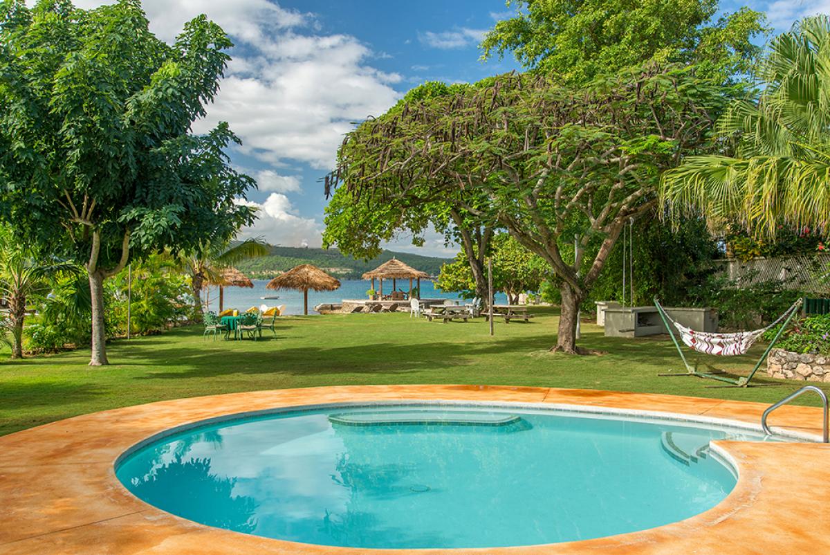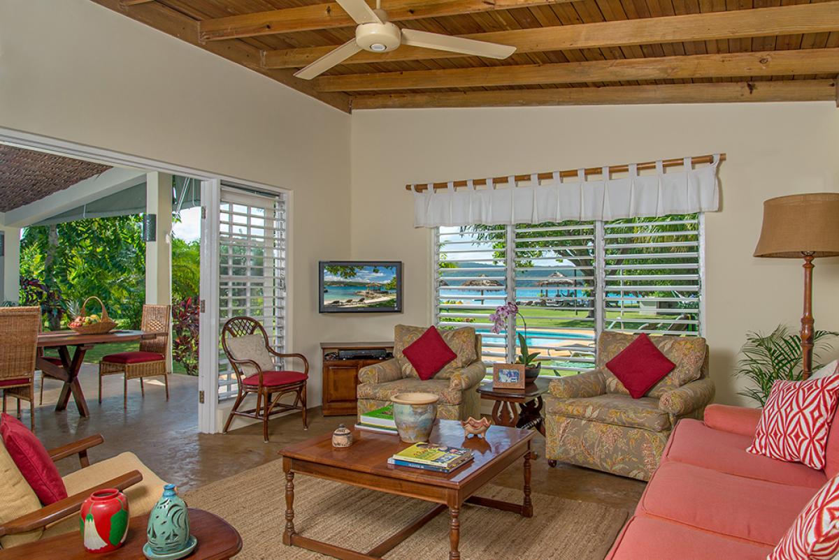 This 3-bedroom casual cottage shares a delightful waterfront site with its sister property, Coral Cove Villa, on the clear waters of Discovery Bay. Linga-Awile sits on a lovely, long, large lawn. Beyond the lawn and swimming pool is its sugary white sand beach with two thatched roof umbrellas for shade.