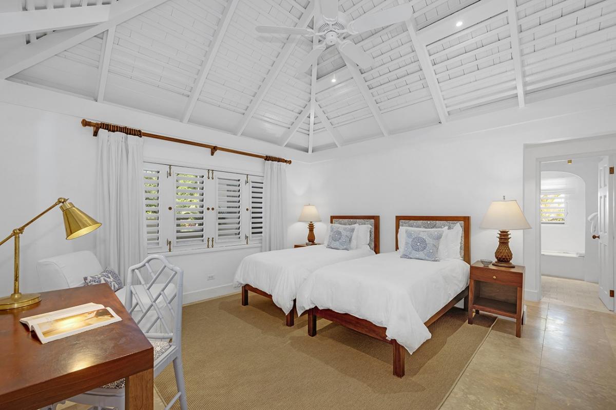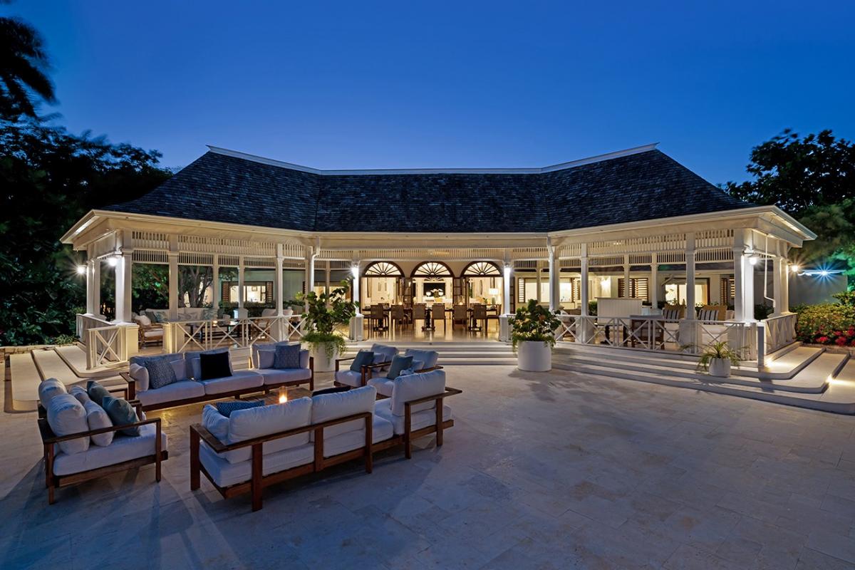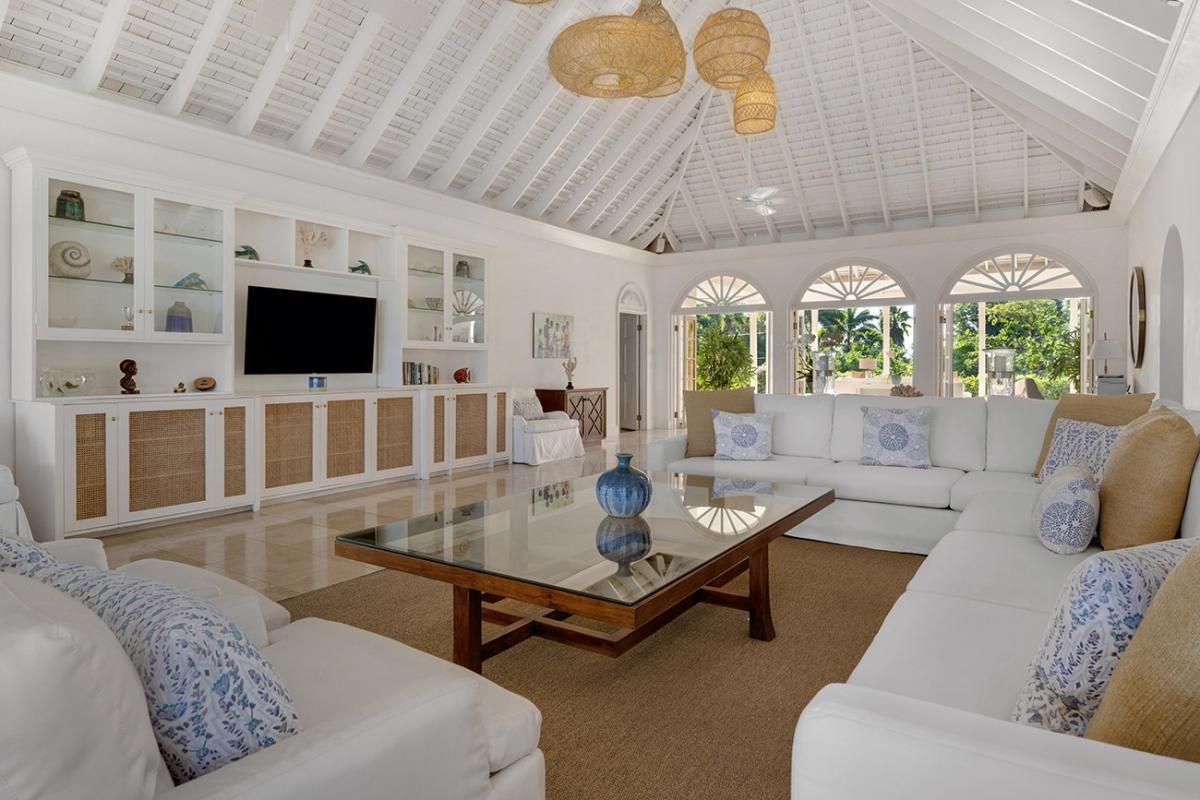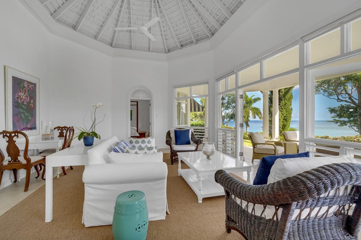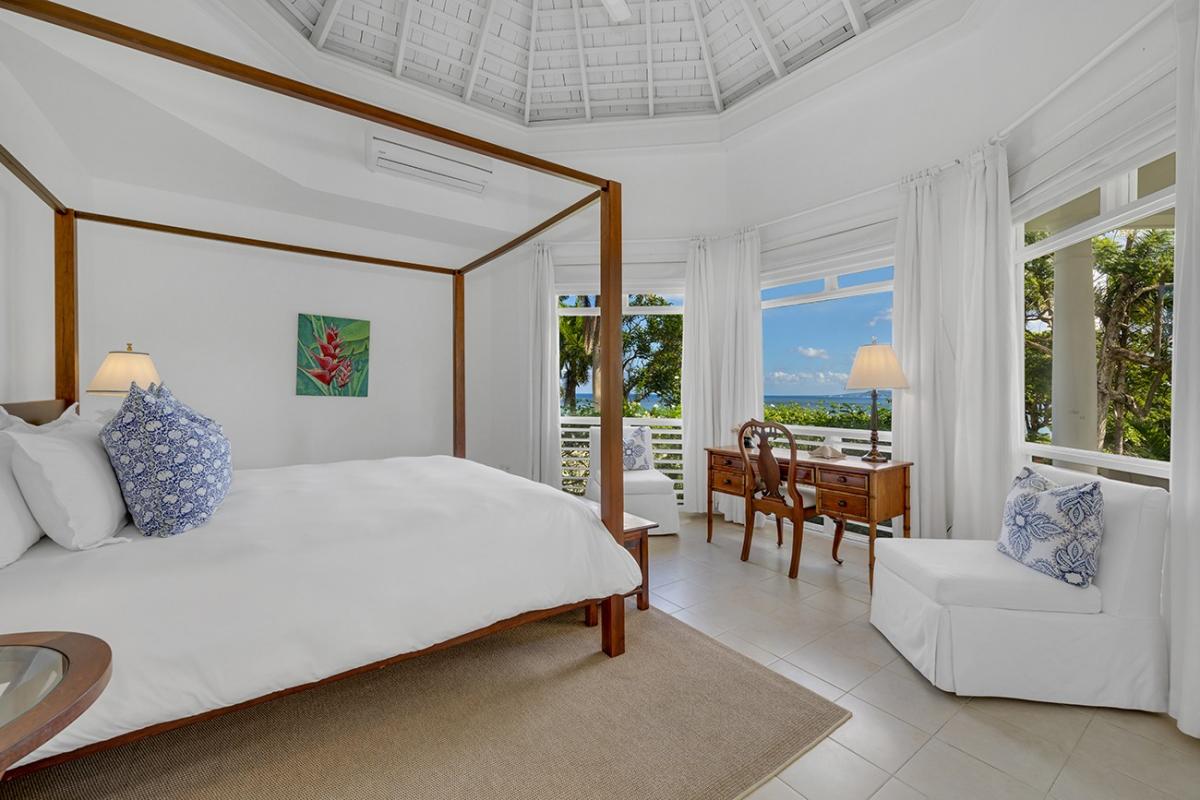The verandahs and Great Room are on 4,000 square feet of cool marble floors, suitable for dancing to music from the indoor/outdoor sound system. From the Great Room, 12 French doors open wide, and nine ceiling fans augment the almost non-stop tradewinds that kiss the top of Round Hill year-round.