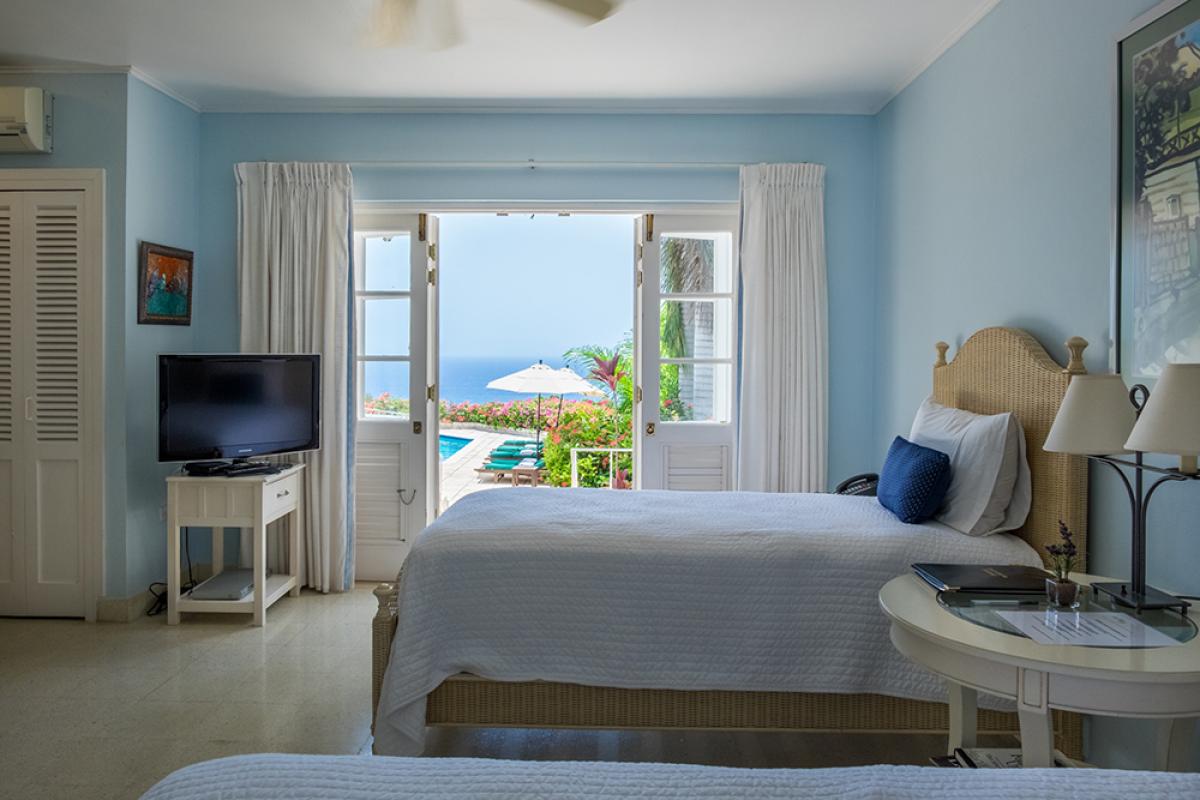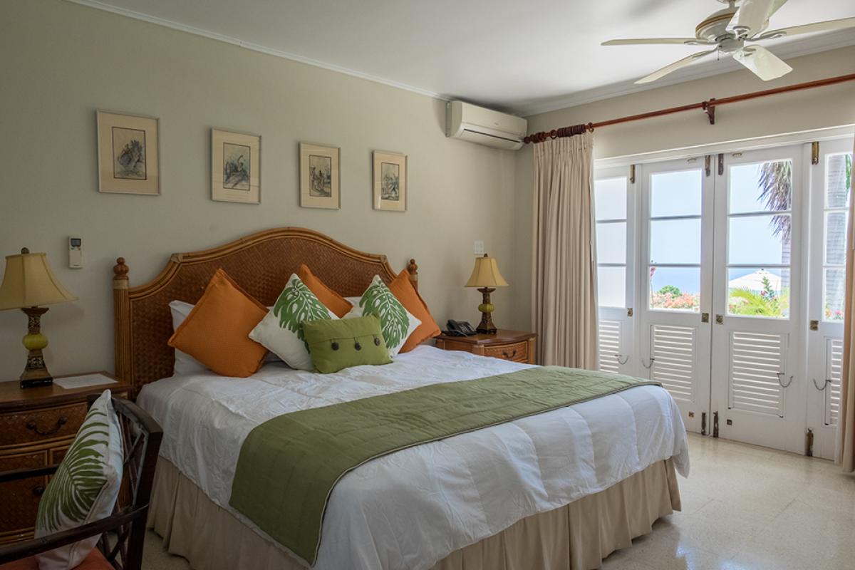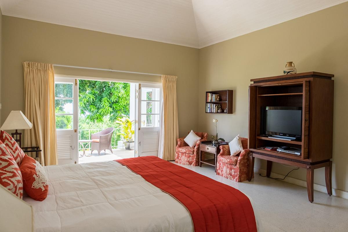 The magnificent view is immediately apparent through carved entrance doors with antique brass fittings. The view becomes more dramatic as one moves through the large living room to the shaded verandah and beyond to the private pool and large lawn. The view from Nutmeg of the deep blue Caribbean Sea is simply breathtaking.