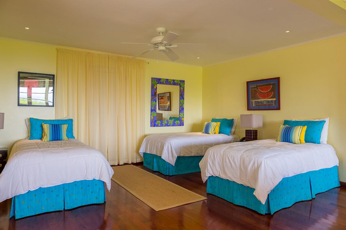 Bedroom 6: This room is located on the main level and is equipped with either three twin-sized or one twin-sized bed plus a king-sized bed. This room is an extremely spacious room with a pool table, a wall-mounted 40" television, a kitchenette, and an ensuite bathroom with a walk-in shower. This room is accessed by an exterior spiral staircase and opens to a private terrace and pool.