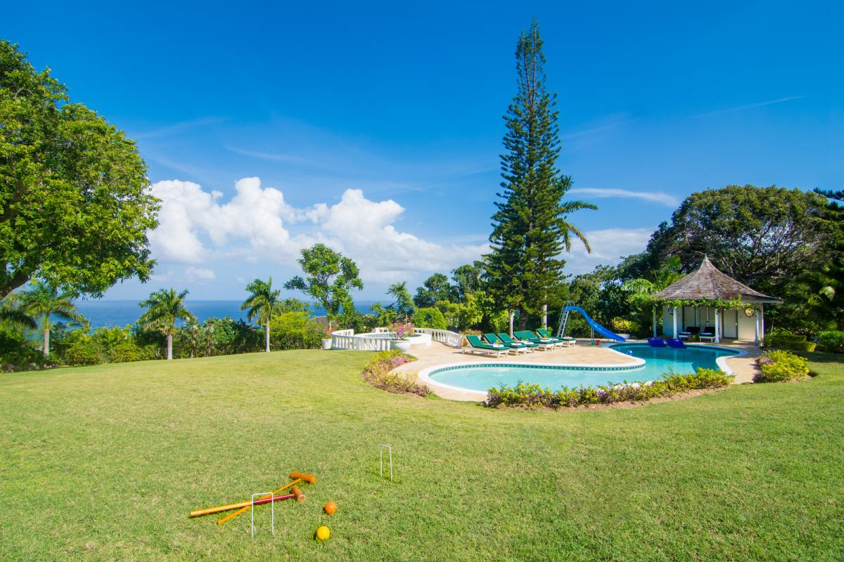 Next to the main verandah is the bamboo wet bar. A short walk across the broad grassy lawn is the spacious swimming pool. The adjacent outdoor Jacuzzi is large enough to seat 15 adults comfortably. Nearby is the cabana with television, stereo, CD player and Playstation 2.
