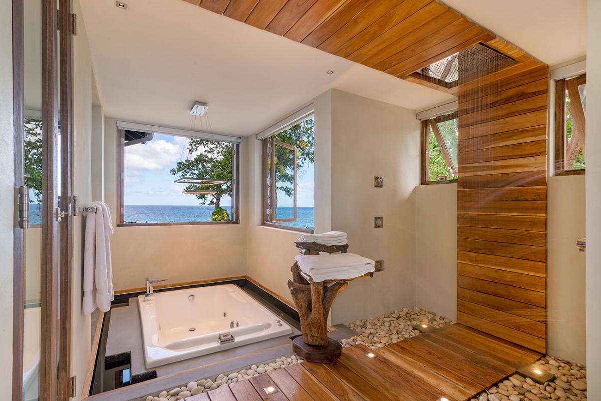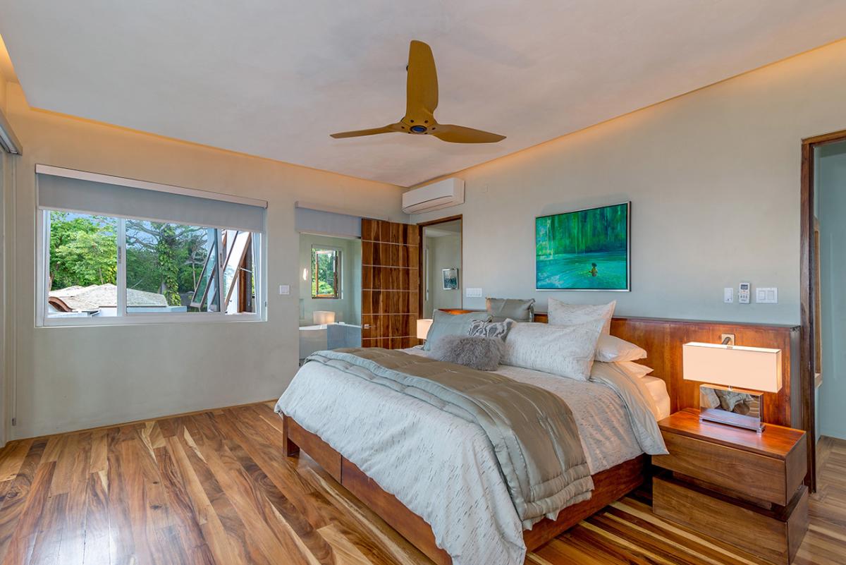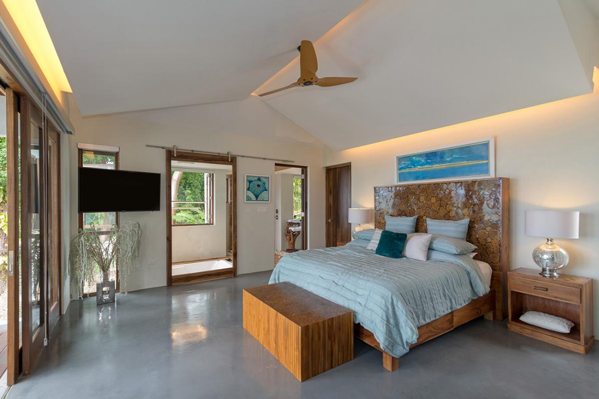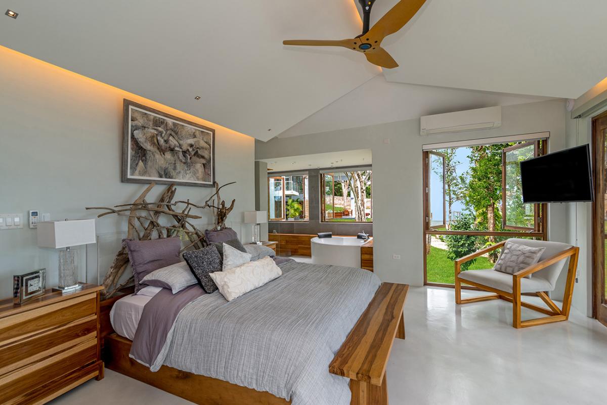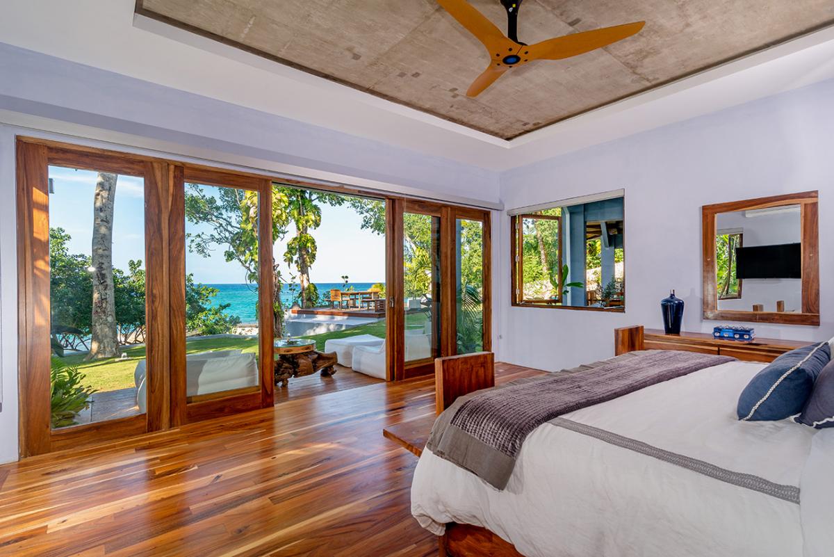 Bedroom 6: This room is located on the upper level of the east wing. It is equipped with a king-sized bed, a ceiling fan, a flat-screen TV, and remote-controlled air conditioning. This suite also has an en-suite bathroom equipped with double vanities, a stand-alone tub, and a walk-in rain shower. The room also has french doors that open to a balcony.