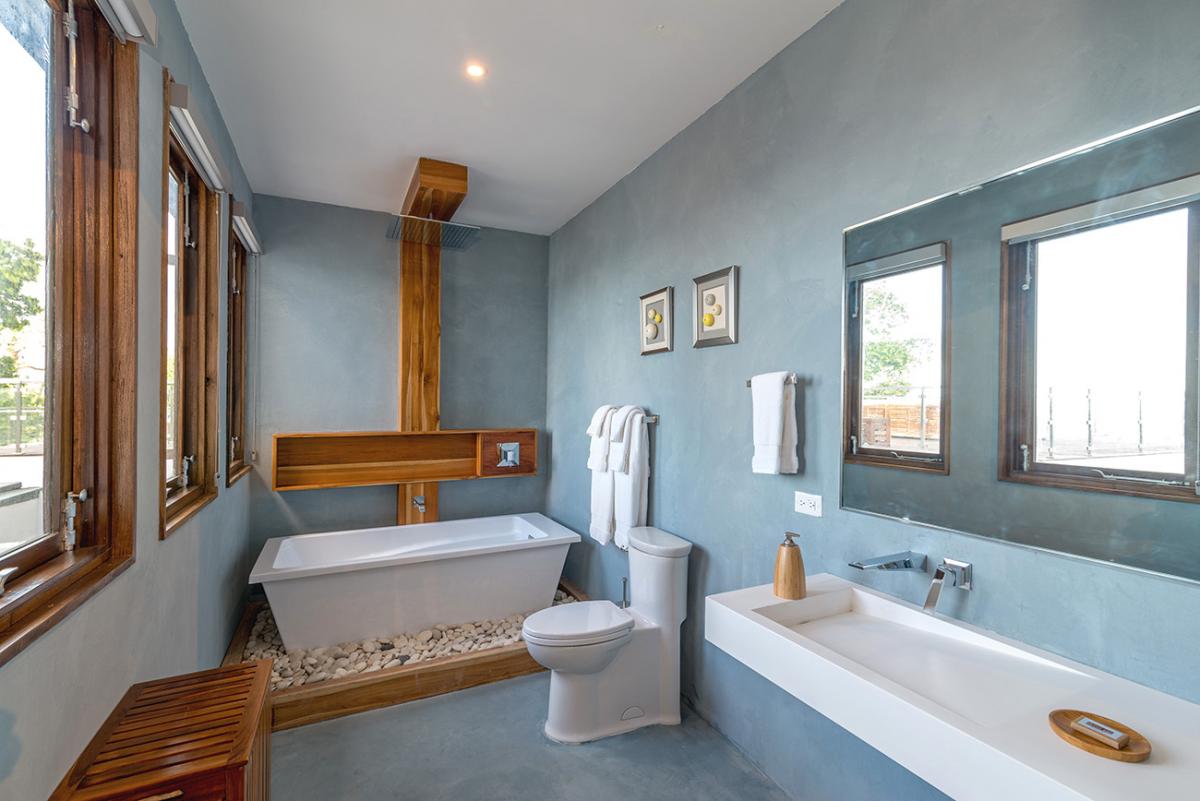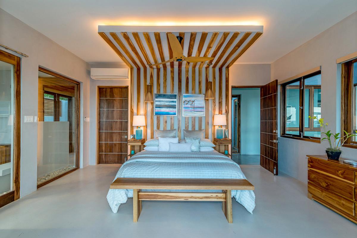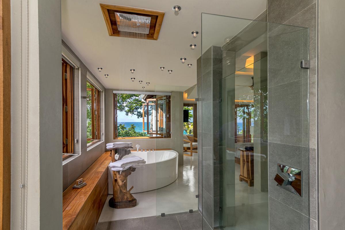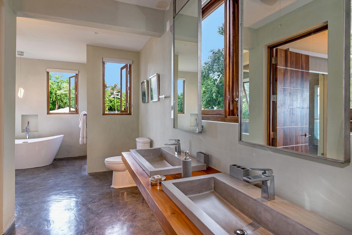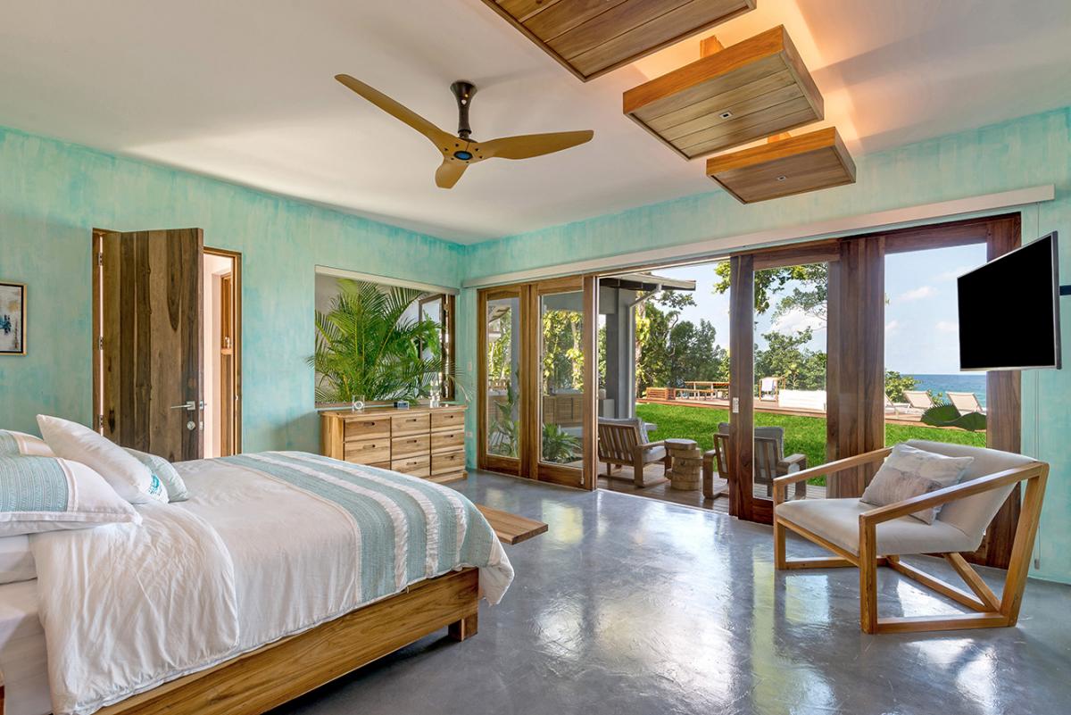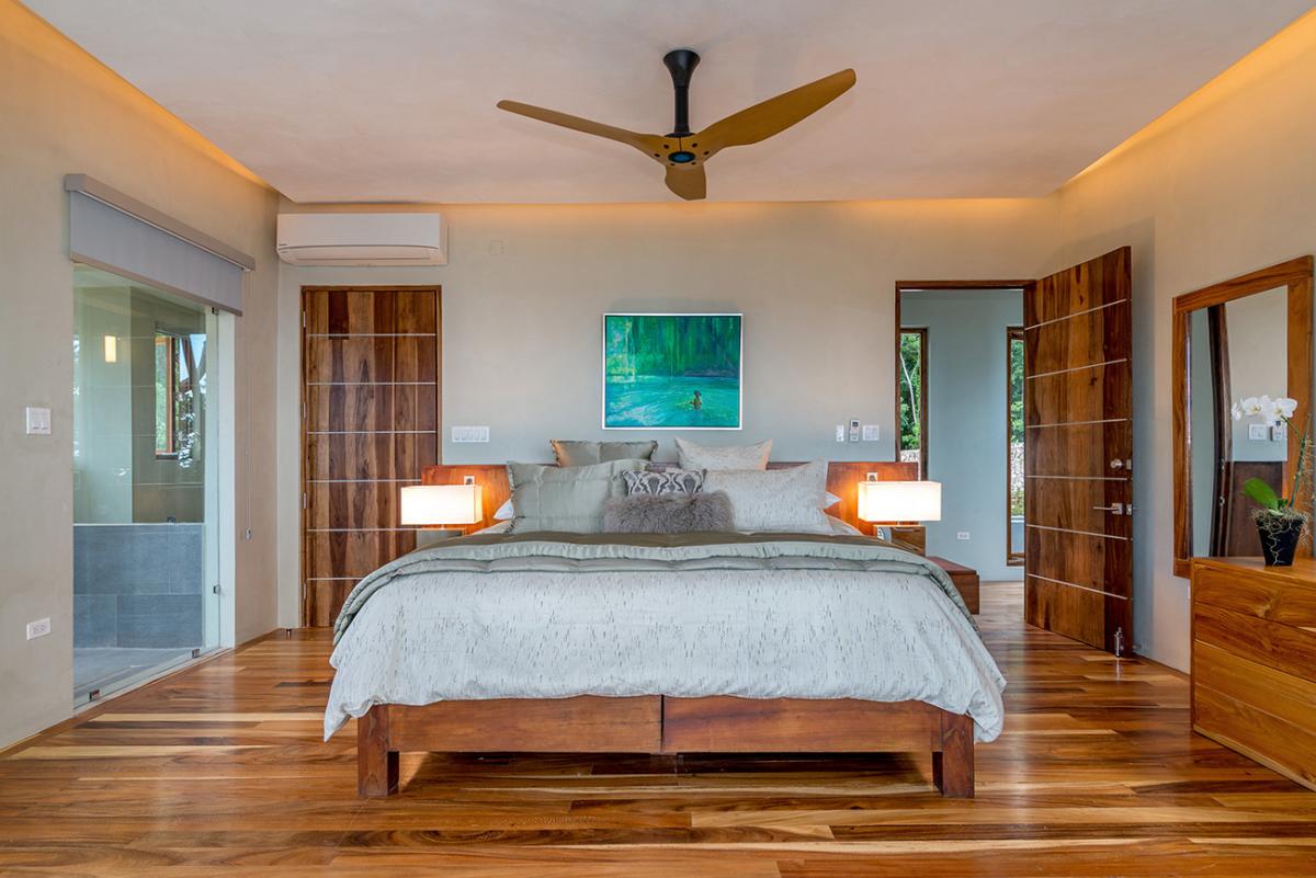 Bedroom 6: This room is located on the upper level of the east wing. It is equipped with a king-sized bed, a ceiling fan, a flat-screen TV, and remote-controlled air conditioning. This suite also has an en-suite bathroom equipped with double vanities, a stand-alone tub, and a walk-in rain shower. The room also has french doors that open to a balcony.