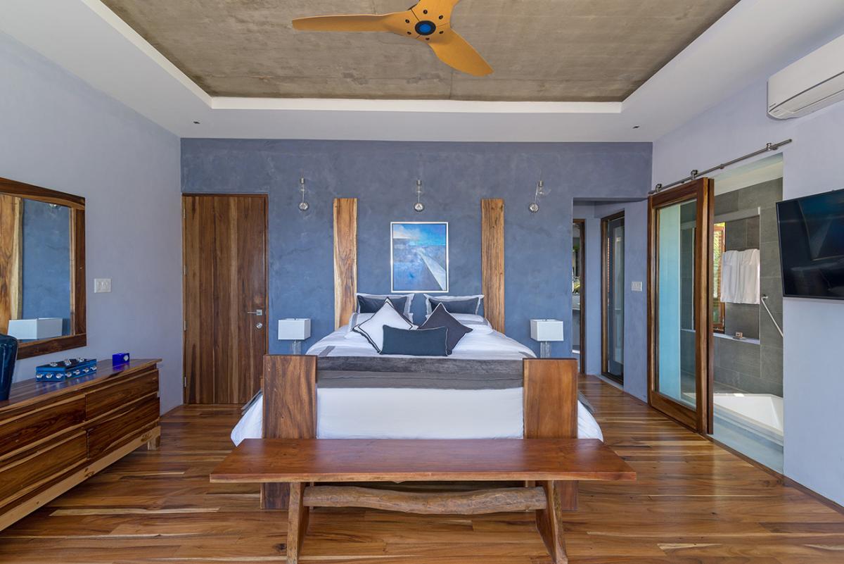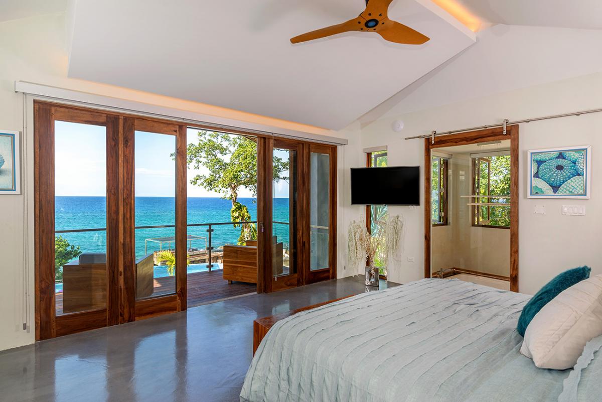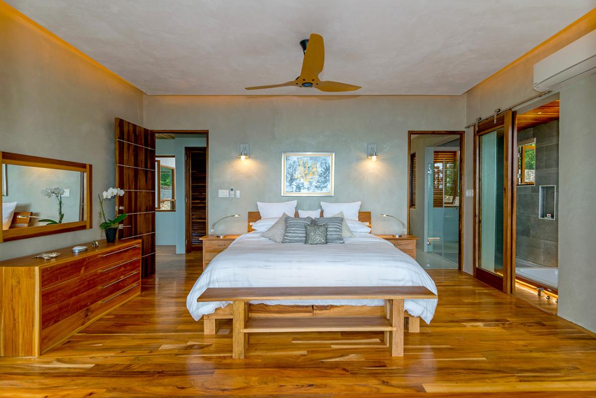 Bedroom 7: This room is located on the upper level of the west wing. It is equipped with a king-sized bed, a ceiling fan, a flat-screen TV, and remote-controlled air conditioning. This suite also has an en-suite bathroom equipped with double vanities and a walk-in rain shower. The room also has french doors that open to a balcony.