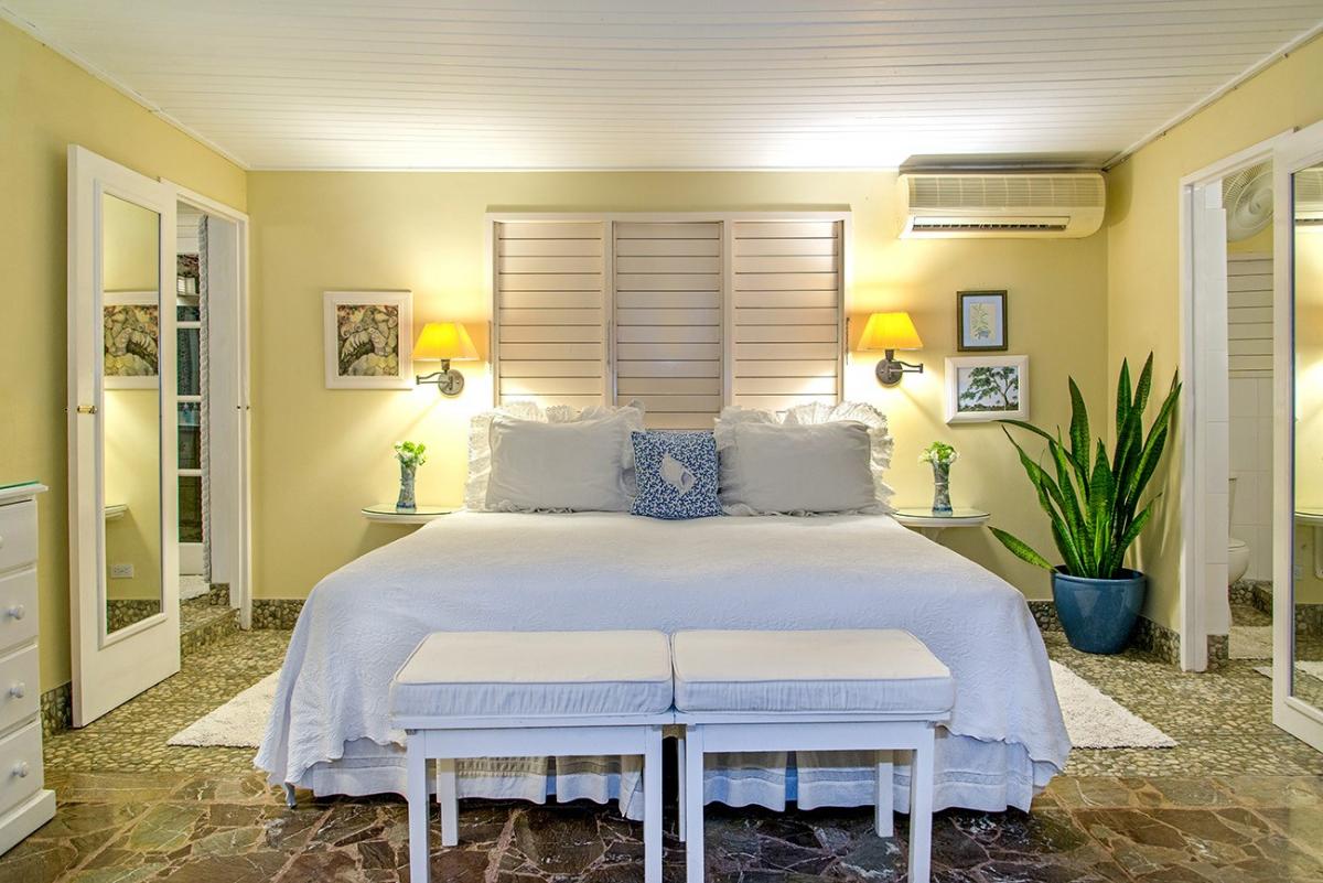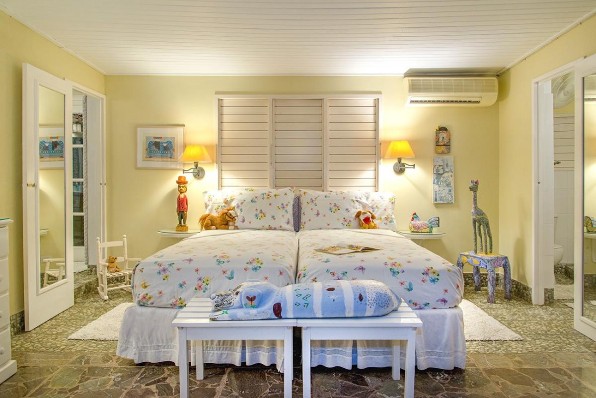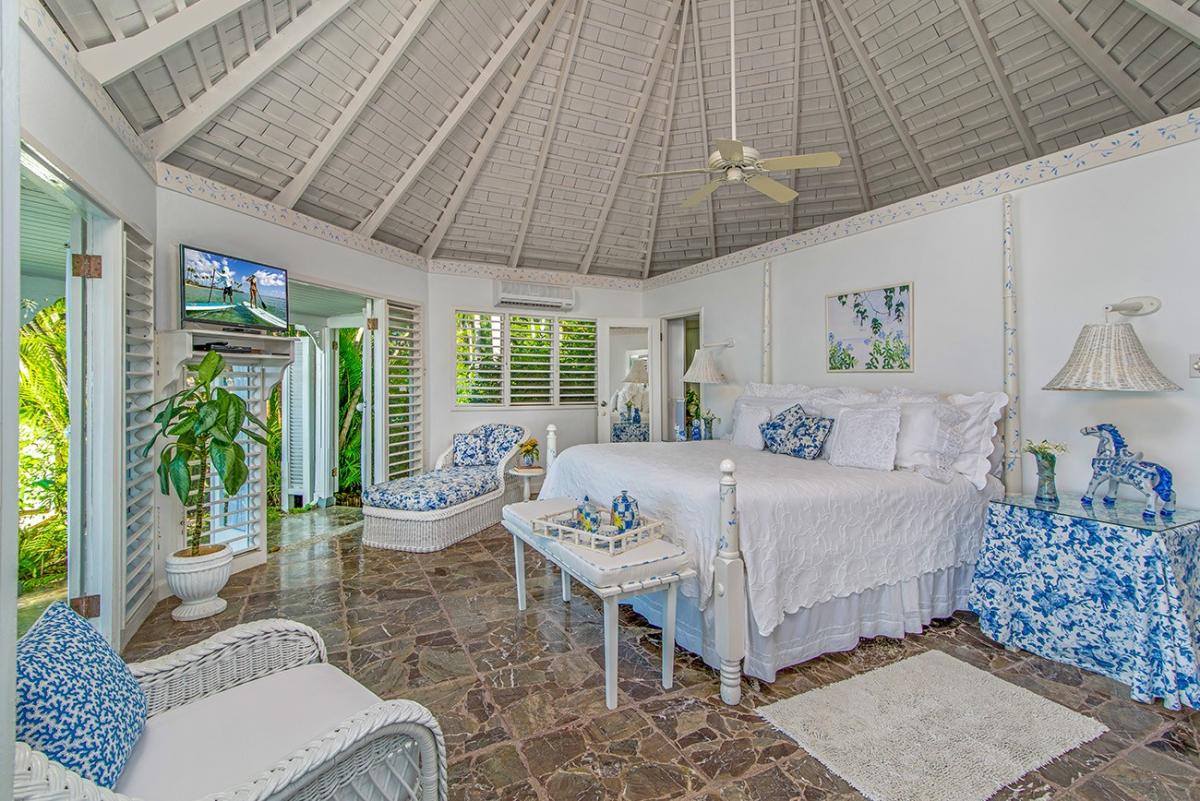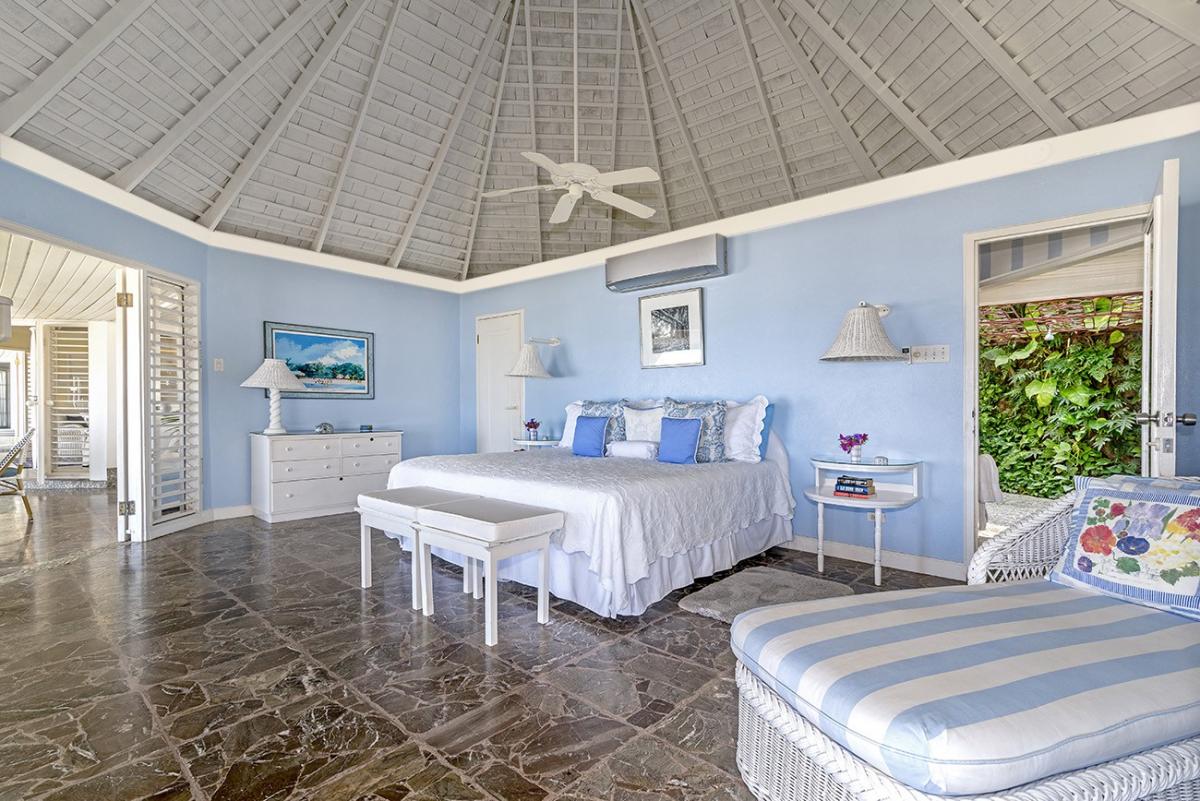 In Caribbean-style architecture, spaces are defined by airy octagonal gazebos and high cedar ceilings. Pretty blue and white fabrics and cool marble floors are throughout. Each bedroom opens to a sitting area for private afternoon naps or all-day gazing at the changing light on the Caribbean Sea ~ practically at your doorstep.