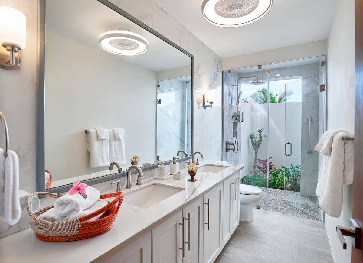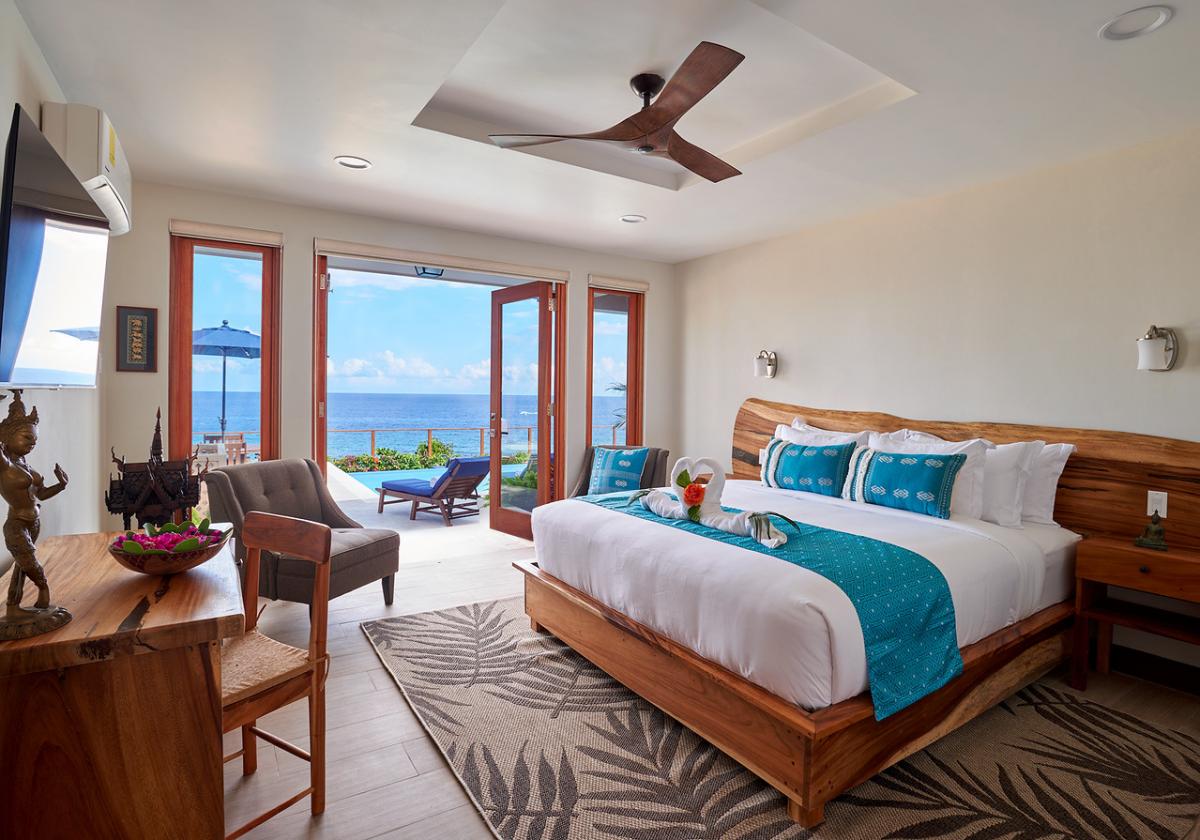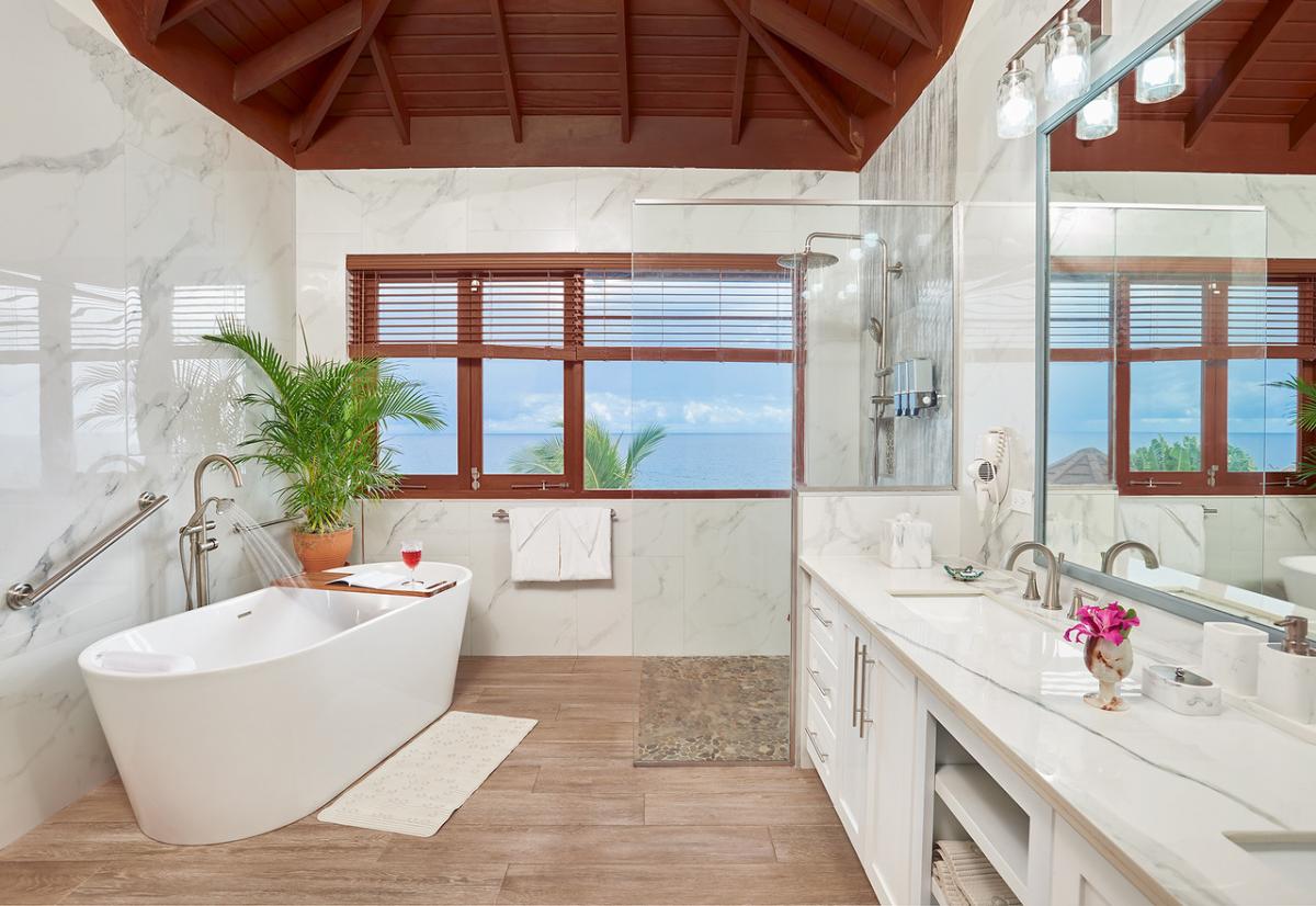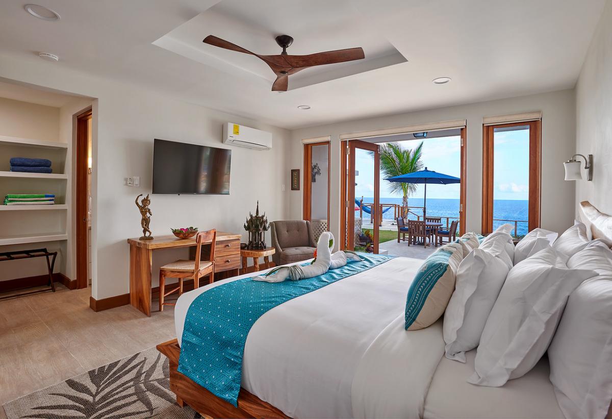Bedroom 1: This room is located on the ground floor and is equipped with two queen-sized beds, air conditioning, a ceiling fan, a flat-screen television with cable access, a walk-in closet, a sea view, and an ensuite bathroom with robes, a safe, double vanities, and an indoor/outdoor rain shower. Bedroom 1 also has French doors to the pool lawn terrace.