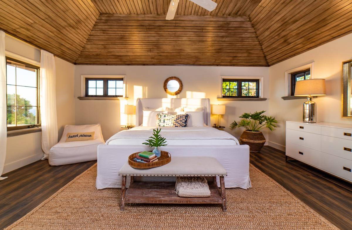 Bedroom 4: King bed with one twin bed (or three twin beds), en suite bathroom with single vanity and walk-in shower, AC, ceiling fan, TV, bathrobes, safe