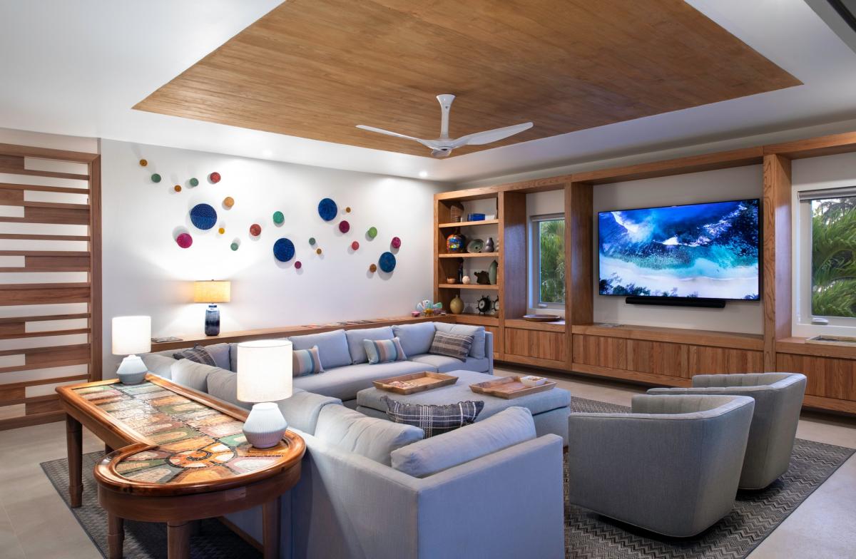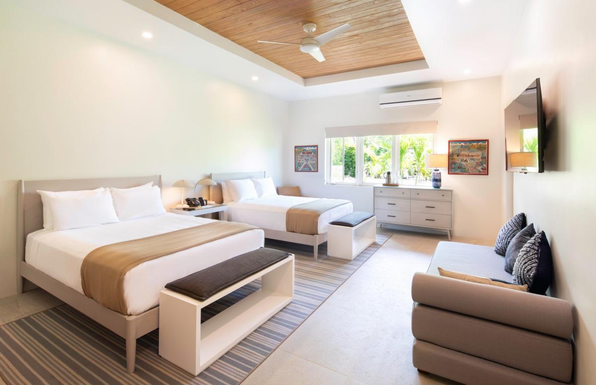 Bedroom 5: This room is equipped with two queen-sized beds, a day bay that can convert to a king-sized bed or two twin-sized beds, air conditioning, a ceiling fan, black-out curtains, a smart TV, a personal safe, and an ensuite bathroom with double vanities and a tub/shower combination.
