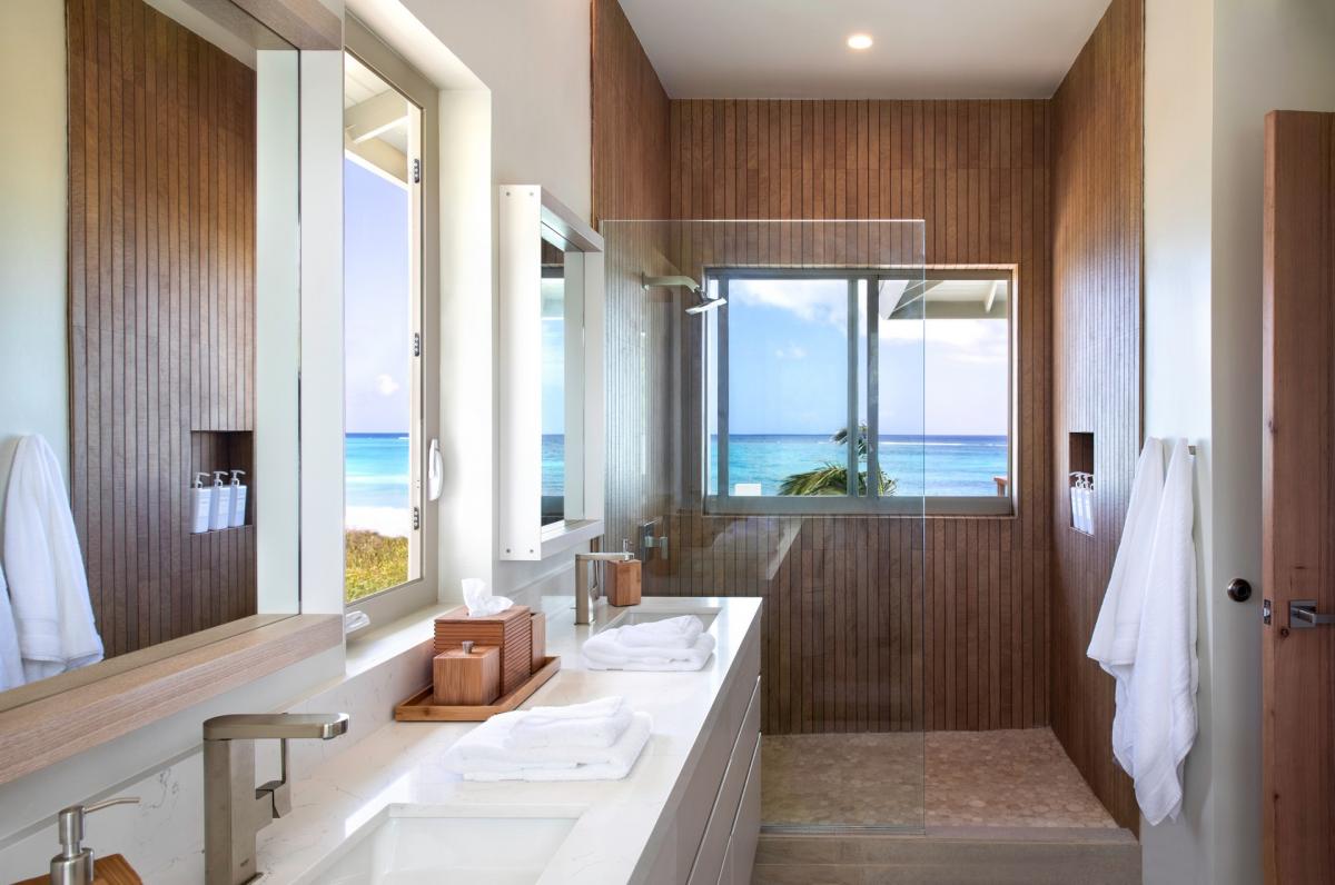 Bedroom 3: This room is equipped with a king-sized bed, air conditioning, a ceiling fan, black-out curtains, a smart TV, a personal safe, and an ensuite bathroom with double vanities and a walk-in shower. Bedroom 3 also has an ocean-view private verandah.