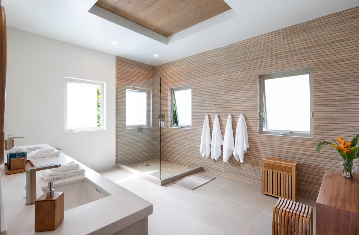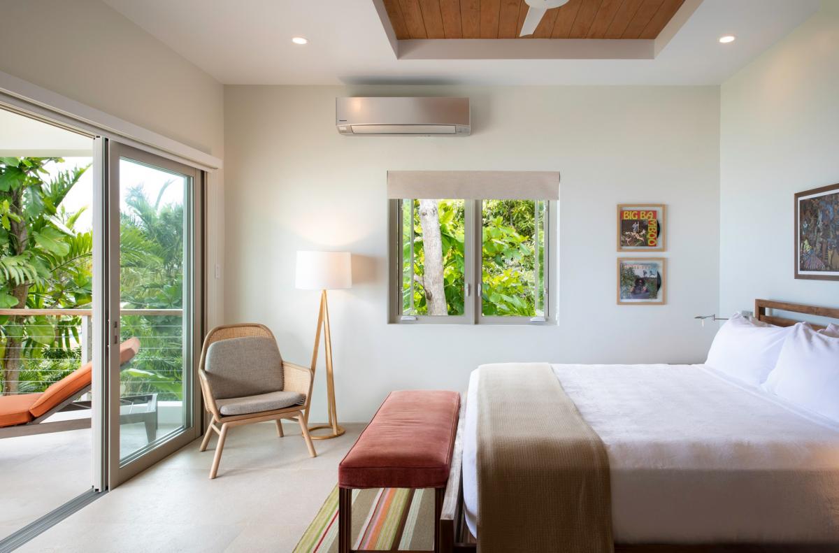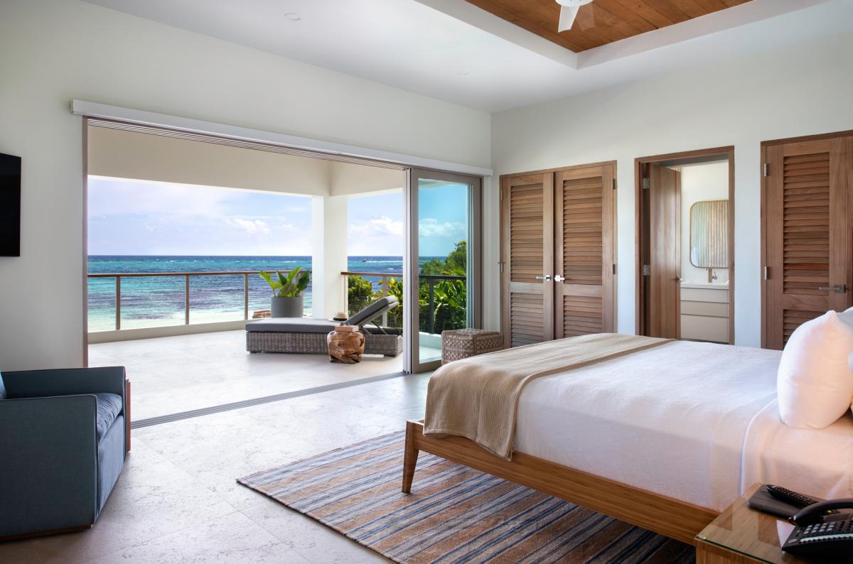 Bedroom 1: This room is equipped with a king-sized bed, air conditioning, a ceiling fan, black-out curtains, a smart TV, a personal safe, and an ensuite bathroom with double vanities and a walk-in shower. Bedroom 1 also has a sea-view terrace with comfortable seating.