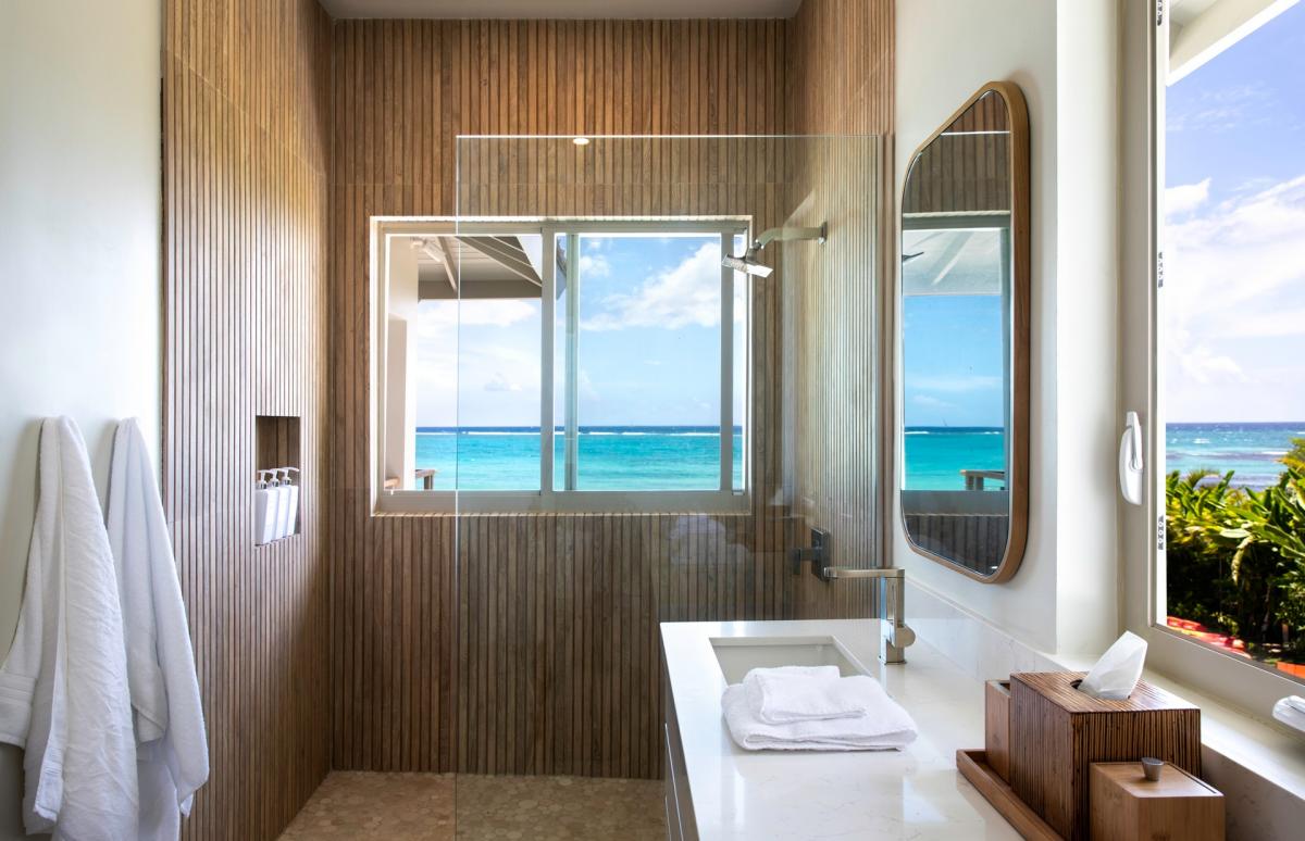 Bedroom 2: This room is equipped with a king-sized bed, air conditioning, a ceiling fan, black-out curtains, a smart TV, a personal safe, and an ensuite bathroom with double vanities and a walk-in shower. Bedroom 2 also has a sea-view terrace with comfortable seating.