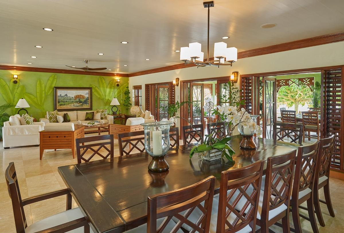 Inside and outside dining tables accommodate up to 14 guests. As a special treat, the staff will plan a torchlight beach party ~ chicken, lobster or fresh-caught fish grilled on the outdoor barbecue. Families renting both villas may have lunches and dinners together on request.