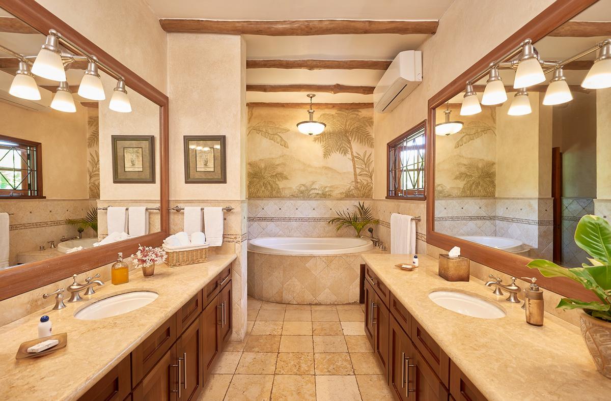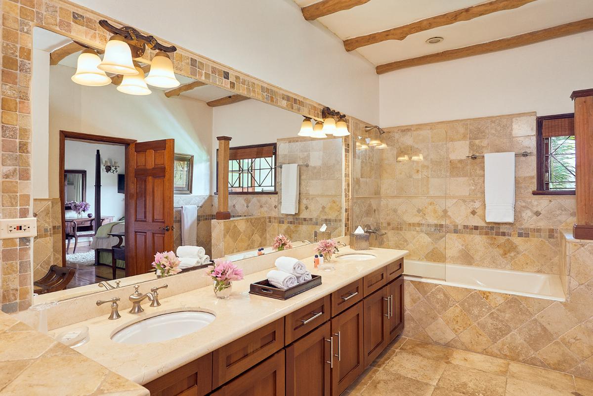 On the main level is the massive Great Room. French doors open wide to a large furnished verandah and bar. Just beyond are the private pool, Jacuzzi, shallow childrens pool, lawn, beach and bay. Upstairs is a second sitting room, entertainment center, Internet area and five of the seven bedrooms. Floors throughout are a combination of gleaming wood and imported stone.