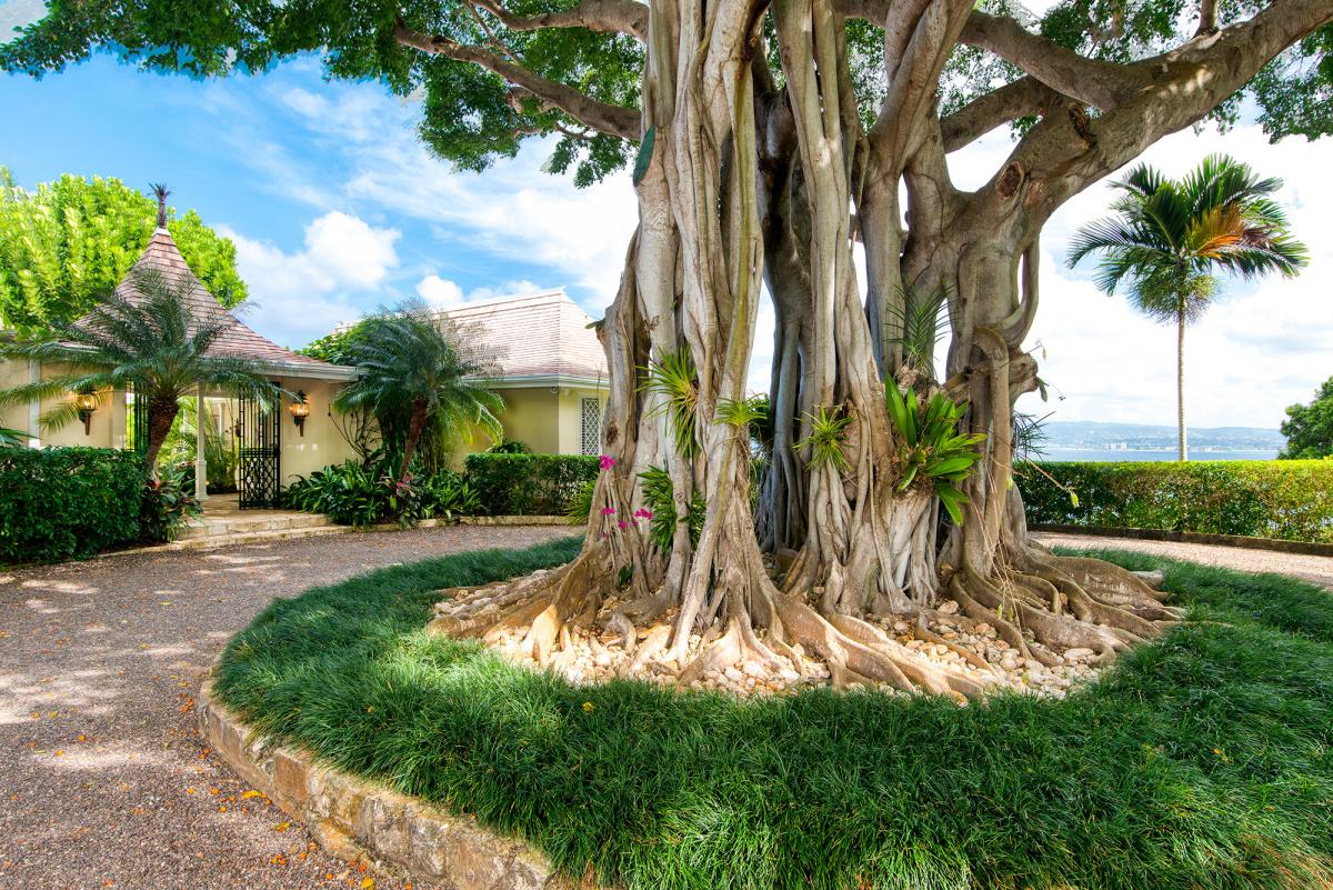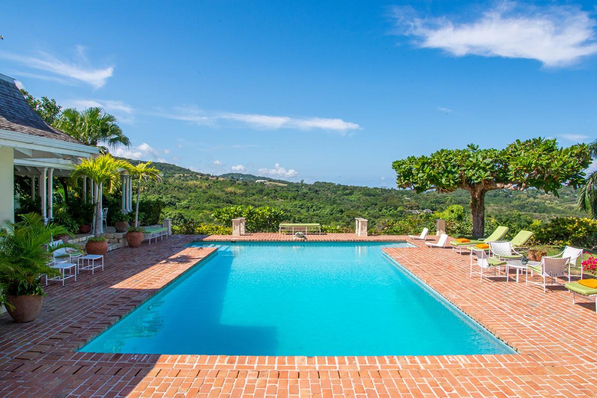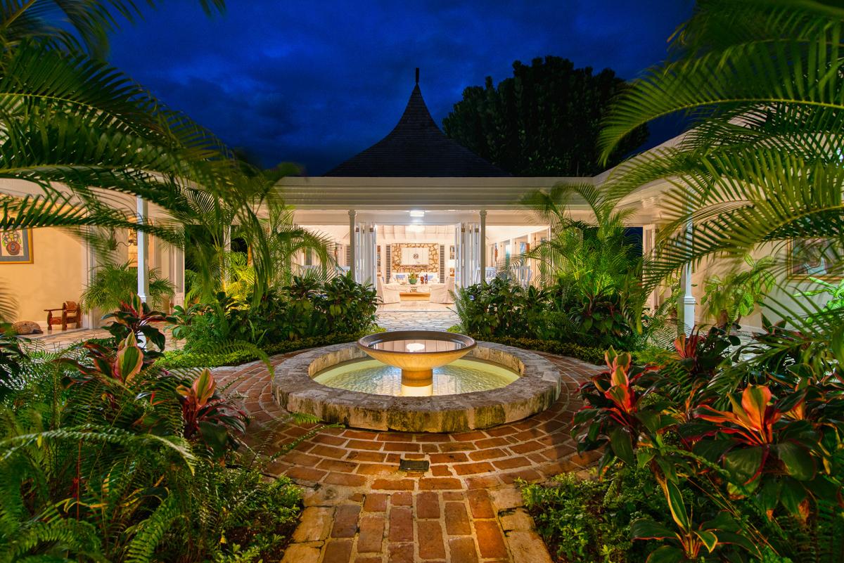Windsong is an exquisite and very private home four minutes from Round Hill. Designed by noted architect Kasimir Korybut, the site benefits from spectacular views day and night and the most favorable tradewinds. The east view captures the sunrise and Montego Bay ~ the west, an equally lovely vista of Round Hill, the sunset and ocean. The grounds are like a park ~ plentiful with tropical trees bearing almond, coconut, lime, avocado, orange, ackee, breadfruit, fig and papaya and adorned by brilliant hibiscus and bougainvillea. Five fountains grace the indoor gardens. From the central fountain, stone walkways lead to the Great Room, inside dining room, bedrooms and bar ... and the wonderful 700-square-foot verandah with its casual al fresco dining area overlooking the pool.
