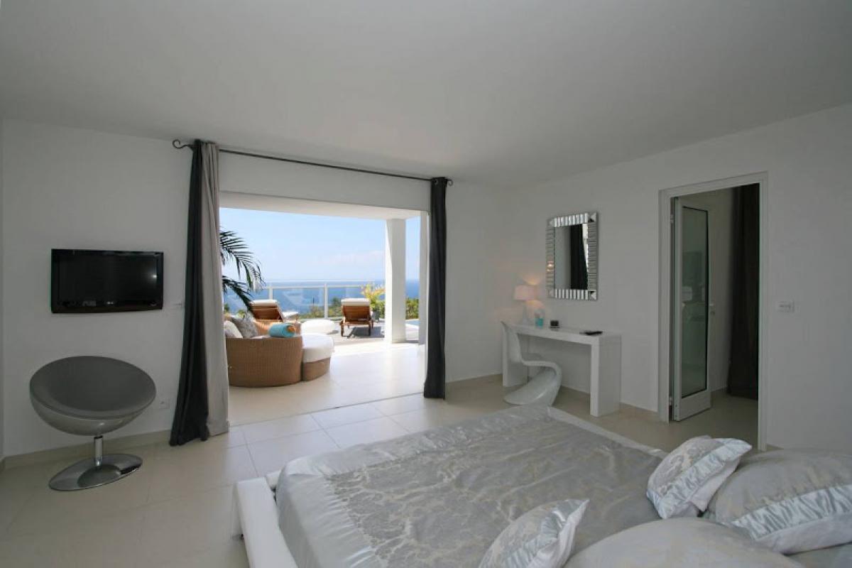 Bedroom 2: white leather French king size bed, ensuite bathroom with shower, access to a terrace that adjoins the pool and a plasma TV