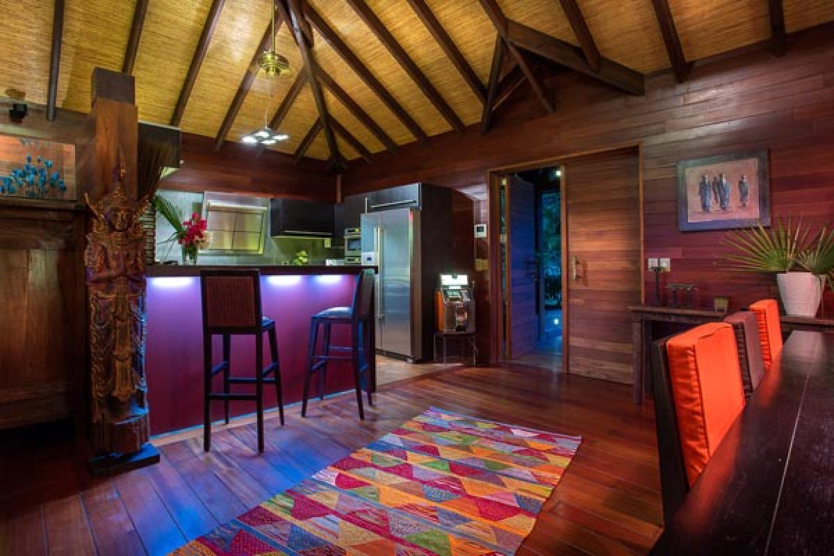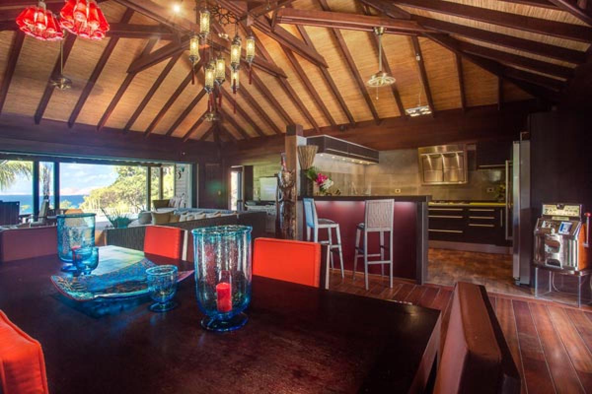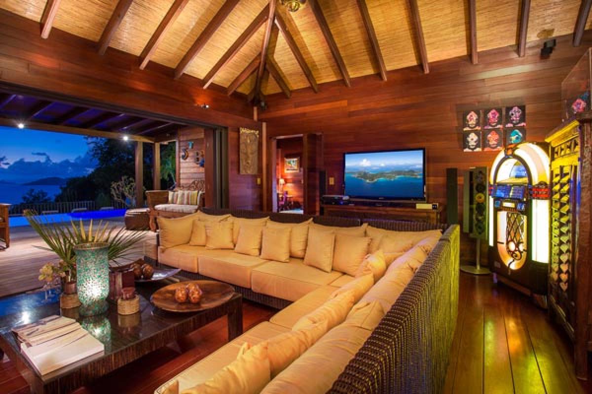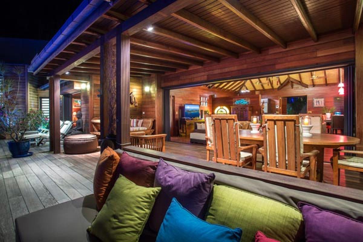 Villa Veronika offers a large living room that opens onto the terrace, infinity pool and view. The large sectional sofa is the gathering spot during an afternoon rain shower or for post dinner cocktails. At the back of the living area is a gourmet kitchen (all the bells and whistles) and breakfast bar. The dining table seats eight guests. A second dining area is located on the covered terrace and offers an excellent view of pool, deck and incredible sea view. There are several lounging areas, located on the multi-leveled deck, which are ideal to relax, read, and sunbathe near the infinity pool, while admiring the sea view.