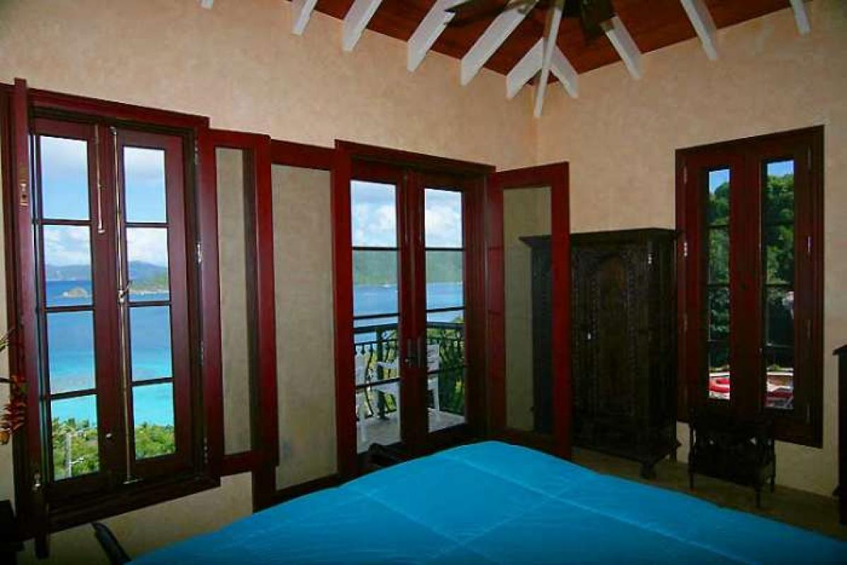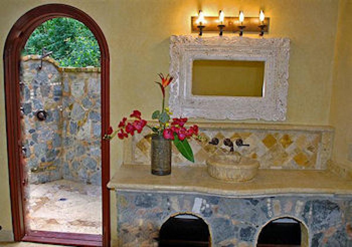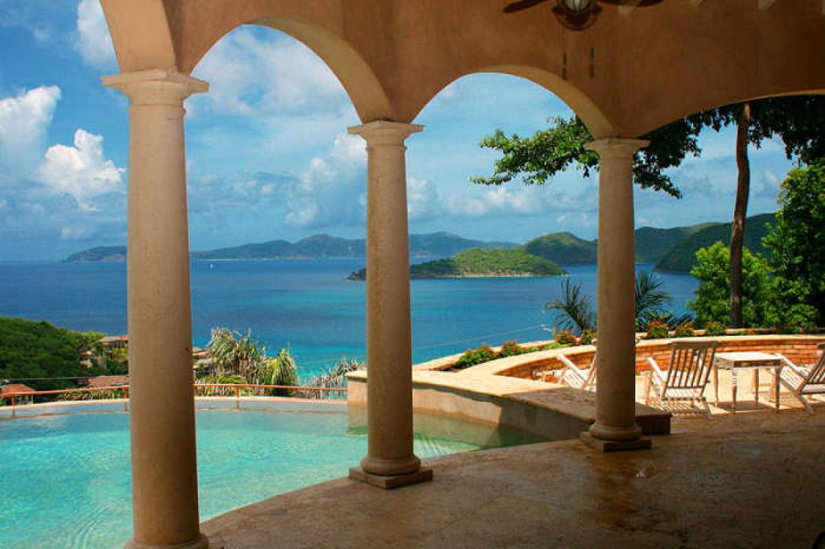 Amorosa is the perfect, luxury St. John vacation rental. This lovely 8,000 square foot villa is located close to Peter Bay and is surrounded by St. John's National Park found on the islands most desirable location. The fabulous north shore beaches at Peter Bay, Trunk Bay, Cinnamon Bay, Maho Bay, Francis Bay, Hawksnest, and more, are only a few moments drive in either direction. In fact, your own Peter Bay beach can be walked to from Amorosa in a lovely 5-10 minute stroll. Views from the villa in St. John stretch from Cinnamon Bay, out to Jost Van Dyke and the BVI, and out to Francis Bay and Tortola. The design of Amorosa captures the old world splendor of a great Italian villa dating back hundreds of years. At the same time, all the modern conveniences blend. The 14' waterfall between two ponds sits beneath the upper terrace spa and surrounds the 8 person outdoor bar and barbecue. The vanishing edge pool is surrounded by sun terrace and verandah. Indoor features begin with a charming marble and stone wine tasting room, but be sure to view some photos of the many amenities.
