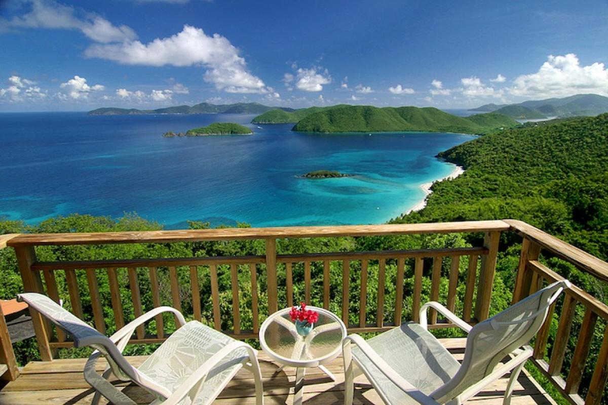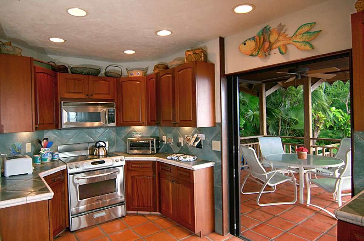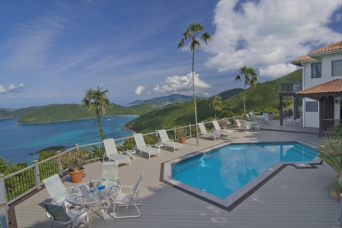 The exclusive Catherineberg and National Park setting of Cinnamon Bay offers some of the most beautiful views and undisturbed tranquillity available anywhere in St John. In addition, you are only a few minutes from the pristine North Shore beaches and Cruz Bay restaurants. Like the setting, the villa itself is superb. With its 35 foot beamed cathedral ceilings, terra cotta tiled floors, spacious living area and wrap around decks, this is the very essence of a refined and exclusive, yet very comfortable and inviting island Villa. The views from the balconies and bedrooms are among the best in the world. As you enter Cinnamon Bay, to your left and right are handsome mahogany stairs that lead up to very private master and guest bedrooms, both with king bedsand private balconies. The master bedroom has a large walk-in closet, cathedral ceiling, ceiling fans, a tiled bath and shower, and a relaxing whirlpool bath. The upper level guest bedroom has a 180 degree Caribbean panorama and a tiled bath and shower. The ground floor guest bedroom opens to a private cocktail deck, and has two twins that can be prepared as a king. The kitchen should keep any gourmet chef happy with a brand new stove, refrigerator, microwave, dishwasher, toaster oven, blender, coffee maker, and telephone. A half-bath & washer/dryer are located off the kitchen. A gas barbecue is located on the covered deck. Meals may be served at any of three dining areas. From the private fresh-water pool and jacuzzi, to the enormous balcony with elegant patio furnishings, there is no view in the world that compares with the Cinnamon Bay North Shore View. A private pool and hot tub with spectacular North Shore panoramas, and your private master bedroom balcony make Cinnamon Bay one of the most beautiful homes in the world!