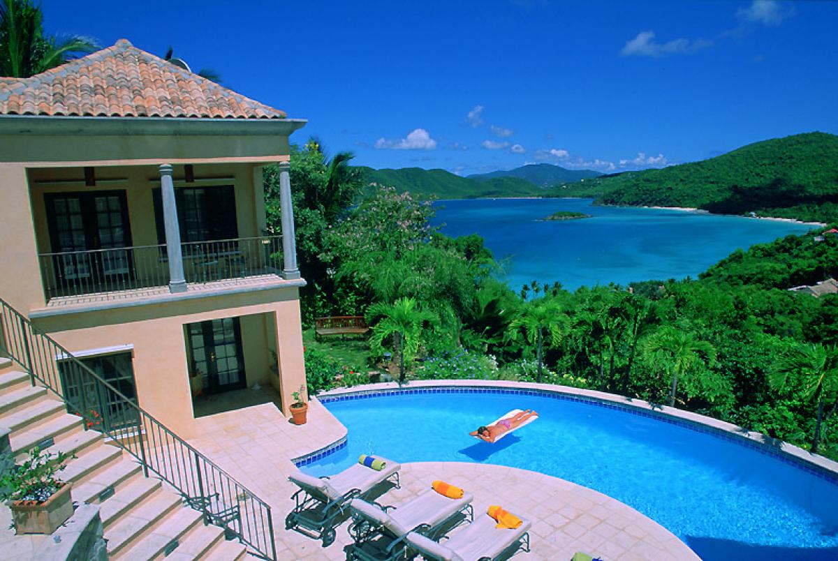 Coco de Mer, overlooking one of the most beautiful and dramatic ocean views in the world, is one of the Caribbean's most magnificent private villas. Designed in a Greco-Roman architectural style, Coco de Mer's palatial qualities are accented with grand Doric columns and an amphitheater that leads to a romantic semicircular 50 ft pool. Located at the exclusive gated community of Peter Bay Estate, Coco de Mer is appointed in 5 star elegance and surrounded by the majesty of pristine St. John beaches and tropical panoramas. Coco de Mer is secluded, private, and tranquil, yet only minutes away from Cruz Bay restaurants and activities. In the style of a Greek Amphitheater, Doric columns and grand archways lead to a 50 foot pool. As at Cinnamon Bay Estate the views from Coco de Mer are truly some of the most stunning views of natural, tropical beauty anywhere on St. John and anywhere in the world. Coco de Mer is located in the upper row of homes that stretches across the small north shore neighbor of Peter Bay. It's about a five minute walk from your villa to the white sands and turquoise waters of Peter Bay Beach. Peter Bay is one of the few parcels of pristine north shore land that was not deeded over to the National Park by Lawrence Rockefeller in the 1950s, and today it remains tranquil, peaceful, private and exceptionally scenic, surrounded on all sides by National Park forests, waters, and reefs. The Peter Bay gated community homes all have deeded access to the beach at Peter Bay, which is located between the National Park beaches at Trunk Bay and Cinnamon Bay, and is very similar to these world class, exceptionally beautiful beaches. The fine white sand and usually calm turquoise waters of this exquisite beach provide excellent swimming and good snorkeling. On a perfect beach day in February, the National park beaches will host hundreds of people, but it's rare to see even a handful of people on Peter Bay (it's privately owned). The gorgeous views from Coco De Mer look north and east and include the lush mountains of the north shore of St. John, Cinnamon, Maho and Francis Bays, Whistling Cay, and Great Thatch and Tortola in the British Virgin Islands. It's a five to ten minute, incredibly picturesque drive to the three restaurants at the acclaimed Caneel Bay Resort, and another five to ten minute drive to the captivating restaurants, shops, and groceries in the fun loving, delightful town of Cruz Bay. Coco De Mer is a spacious, 7000 sq. ft., beautiful estate house that consists of three buildings; a 2-level great house, a 2-level guesthouse to the west of the great house, and a private 1-level guesthouse to the east. Coco de Mer sits on .6 acres overlooking Cinnamon Bay and Francis Bay, allowing privacy and seclusion for up to five couples, and plenty of space for weddings and special event functions. Beautiful tropical gardens grace the Coco de Mer grounds. The walking trail to beautiful Peter Bay Beach, exclusive to the Peter Bay community, begins at the gardens below the pool. The peaceful, private, and exclusive Peter Bay location, and the overall commitment to a luxurious design and excellent fixtures, furnishings and equipment, makes Coco De Mer an exceptional rental villa that is certainly one of St. John's most exclusive. Peter Bay Estate, the gated community where Coco de Mer is located, is certainly among the most beautiful neighborhoods in the world.