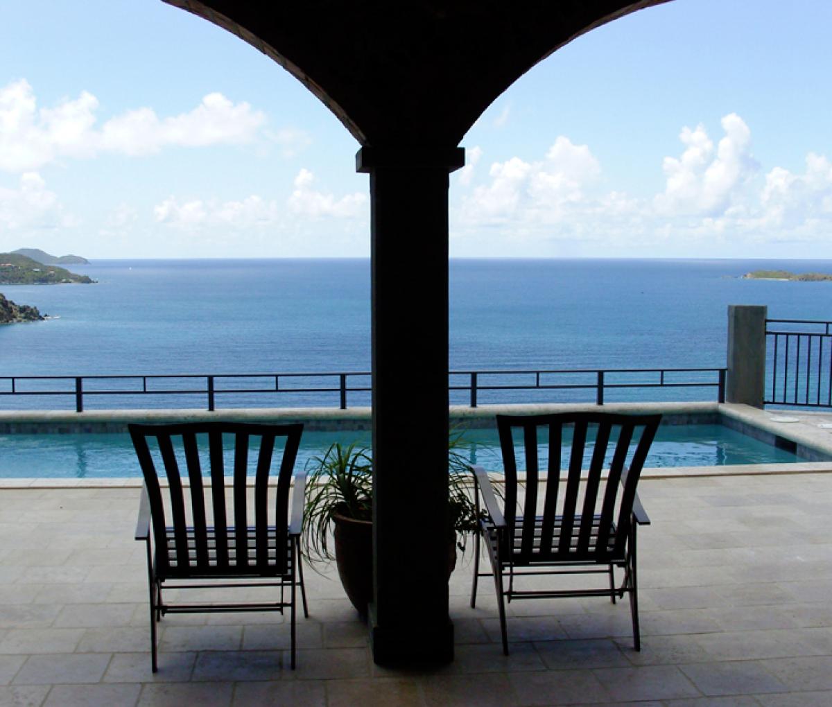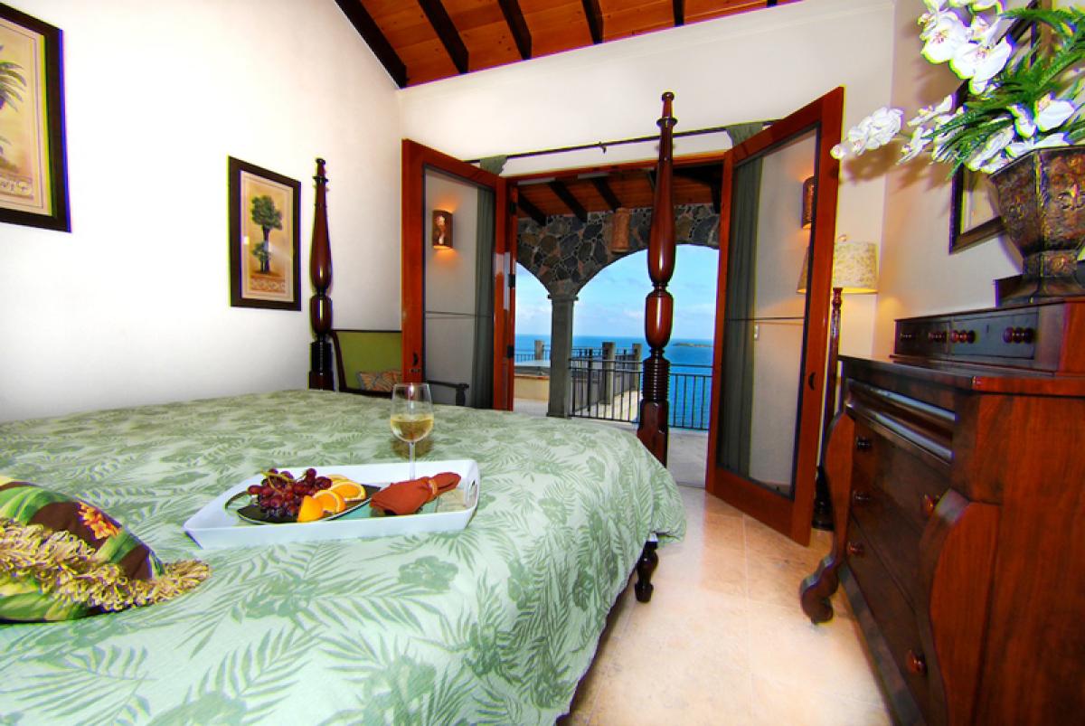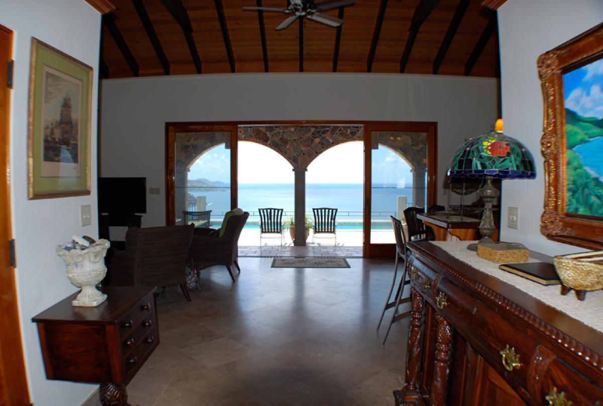 Estate Fortsberg has a very special and extremely private location on the beautiful island of St. John. Located on a private promontory of land within the National Park boundaries, overlooking Hurricane Hole and Coral Bay, it sits at an elevation of 260’ on historic Fortsberg Mountain. The home encompasses 270 degree views with every window offering a breathtaking delight to the eye. Early risers will be delighted by the gorgeous sunrises to the east. In the evening of the full moon phase, Estate Fortsberg affords phenomenal views of the moonrise. One can look northward to the towering island of Tortola and southeast to distant Norman Island. Estate Fortsberg is a four bedroom, 4.5 bath villa tastefully built and decorated in a traditional West Indian style. The great room is the center of activity, including a gourmet kitchen, dining room, and large living area complete with a wet bar. The home was designed with 4 master bedrooms and baths. You will enjoy the experience of each master bath's private outside stone shower. On the first level, it has a large waterside granite patio with a roofed porch that extends the complete length of the house, offering reprieve from the bright Caribbean sun. Included in this very inviting space directly off the great room, is a swimming pool and hot tub. The lower level includes a beautifully landscaped courtyard, private balconies off each bedroom, and a large covered deck area complete with ping pong and the traditional Soggy Dollar ring toss game. One to four couples or a large family will have ample room for privacy, relaxation, and activities. Three bedrooms have king sized beds and one has two twins convertible to a king. Each bedroom is air conditioned. Children are welcome.