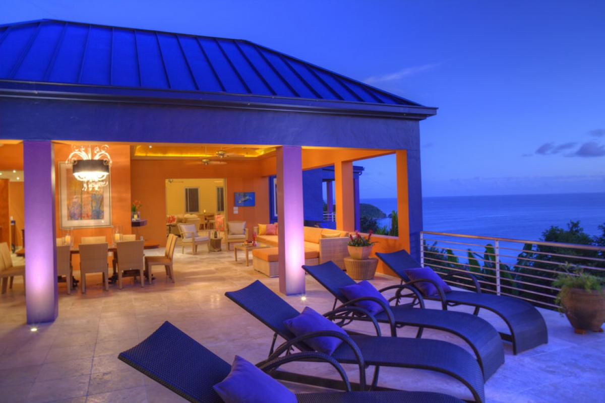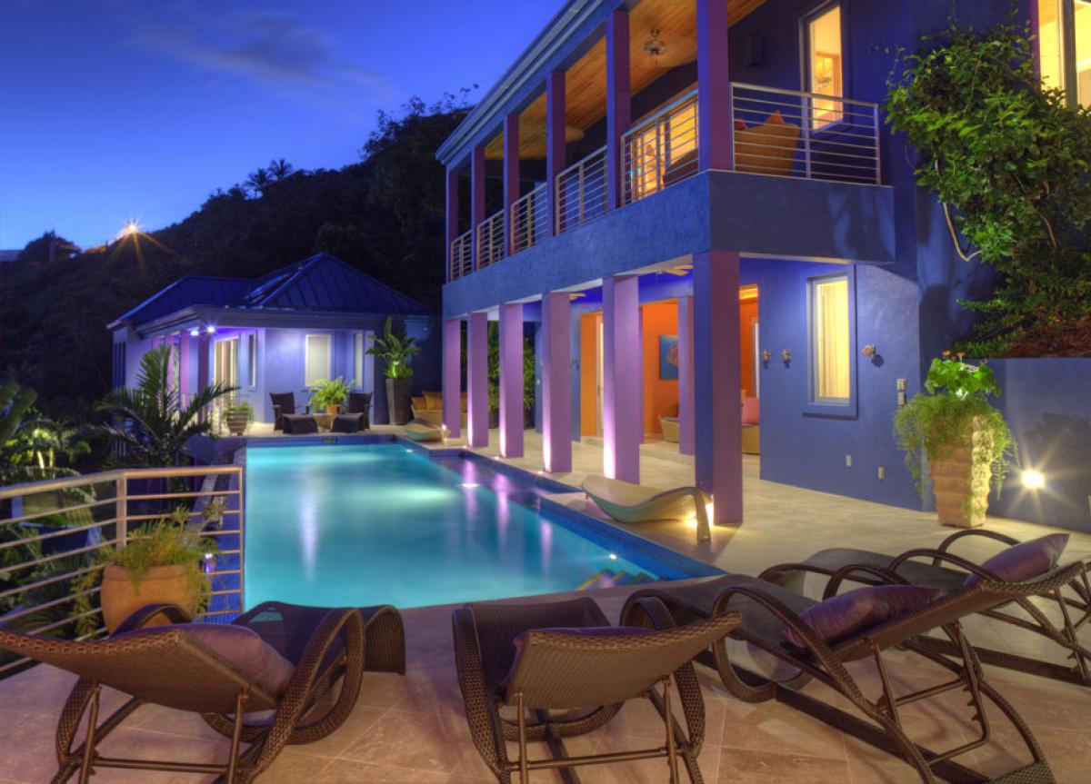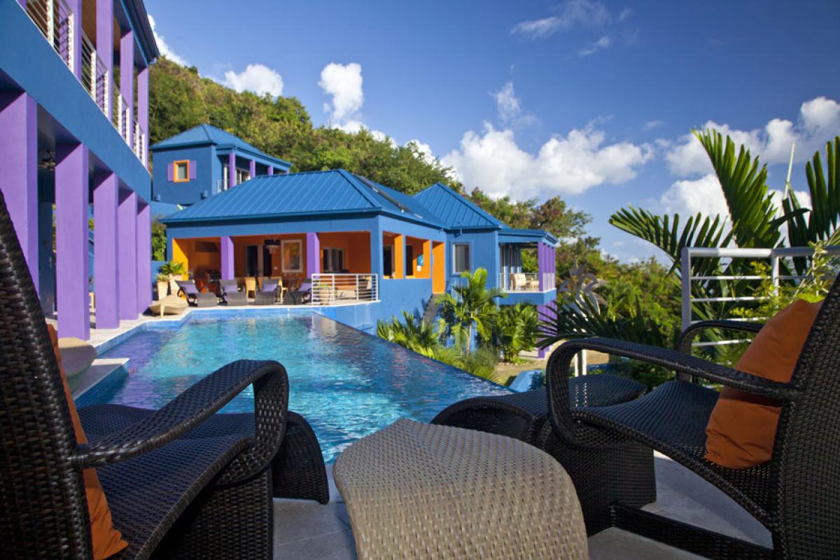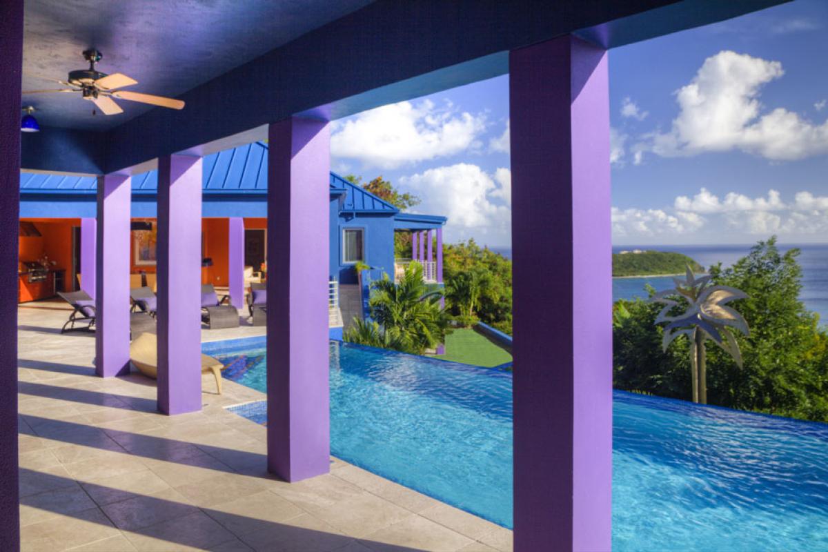 Mare Blu Villa is a striking addition to St. John's beautiful landscape. From a hillside on the exclusive Rendezvous Bay overlooking the majestic south shore, this colorful villa mirrors the dramatic hues of the Caribbean scenery that inspired it. Mare Blu is considered to be one of the most luxurious high-style, high-tech villas on the island of St. John.