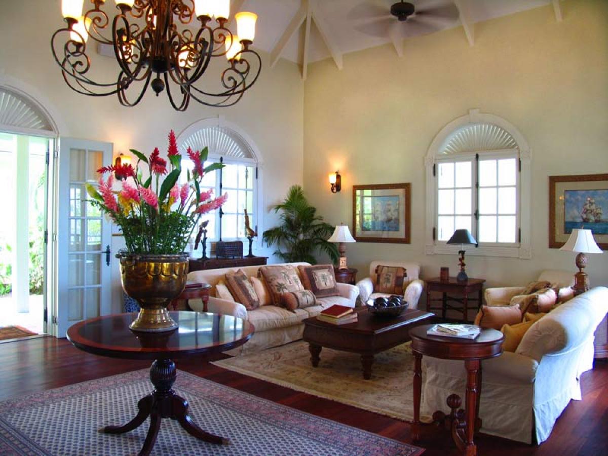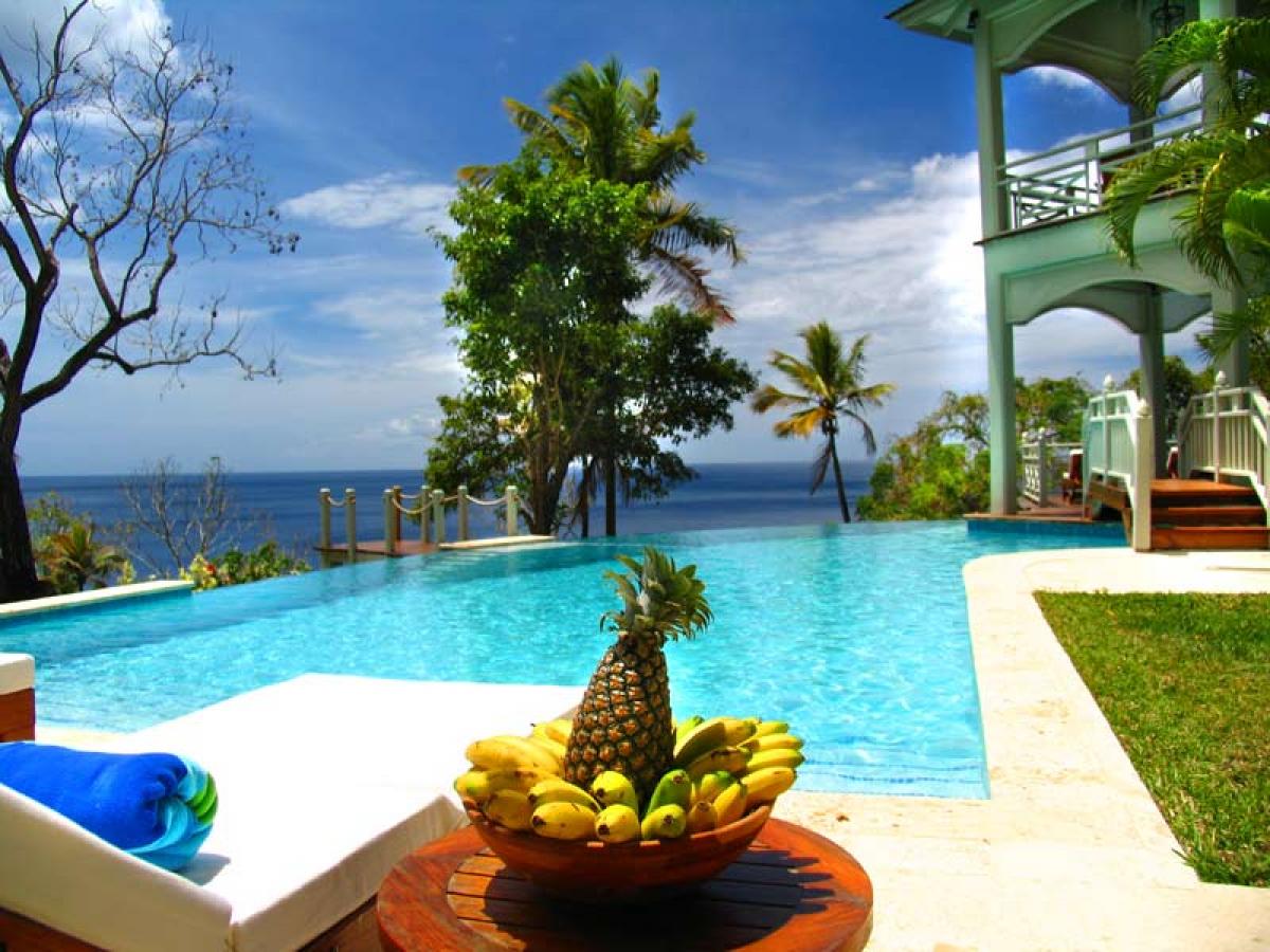 Arc En Ciel is situated above the Caribbean Sea and is a short distance from Jalousie Beach and hotel. Soufriere, which is a sleepy fishing village, also boasts the drive in volcano, hot waterfalls, diving and snorkeling at Anse Chastanet beach, and exotic tropical gardens and mineral baths at Diamond Estate. Arc En Ciel has been imaginatively designed to a very high standard by architect Lane Pettigrew, who has also created the interior design with hand made furniture from Honduras, and some select pieces from Tommy Bahama. The house incorporates many aspects of traditional Caribbean style with its verandas, jalousie shutters, and wooden railings. It has been constructed as a number of small pavilions connected by verandas. The exterior of the house has been partially finished with a facing of hand chipped stones to resemble the exterior of the forts, which were constructed on the island many hundreds of years ago. The house is situated in an extensive, landscaped garden that has a wide variety of tropical flowers and trees. Arc En Ciel has 5 double bedrooms all of which are air conditioned with ceiling fans. Each bedroom has its own TV, DVD player, and stereo. Bedroom 1 has a queen size bed and a patio with a unique view of Petit Piton. There is an en suite bathroom, where the wall facing Petit Piton is glass, so guests can enjoy views of this mountain from the jacuzzi bath and the shower. There is a private swimming pool and sun deck that is situated off the bathroom, in an enclosed garden area. Bedrooms 2 and 3 each have a queen size bed, a private patio, and an ensuite bathroom with shower and jacuzzi. Bedrooms 4 and 5, which are situated downstairs and open onto the swimming pool deck, each have two single beds, a private patio, and an en suite bathroom with shower and jacuzzi. The living/dining room is situated in the center of the house and is tastefully furnished and equipped with a TV, DVD player, and stereo. The formal dining table can seat 10. This room opens out onto a patio which leads to a spectacular dining gazebo, where guests can dine with the backdrop of the Caribbean Sea and the Pitons. The balance of the entertainment areas are situated downstairs. Here you can enjoy the outdoor living of the Caribbean in the large, covered patio, with a casual dining area and bar with its own fridge. This leads onto an extensive pool deck and a series of smaller pool patios. There is a comfortable, air conditioned family room with two large sofas, one of which can convert into a double bed. The infinity edge pool weaves its way around this area and includes a stone cave with a waterfall.
