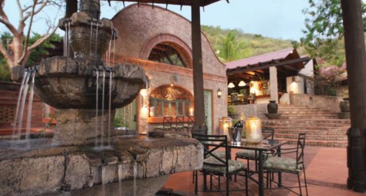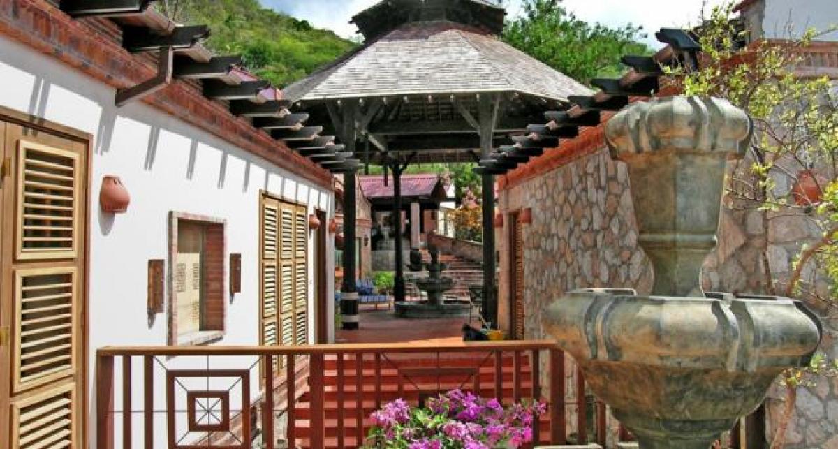 - Temple Suite: This suite has hand carved, antique palace doors from India. This suite has two levels...first level has a gym and a bedroom with three four-poster full size beds and a bathroom. The second level is connected by a stairway that leads to a living room, king size bedroom with ensuite bathroom. The view is of the majestic Pitons.
