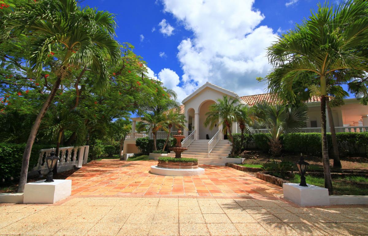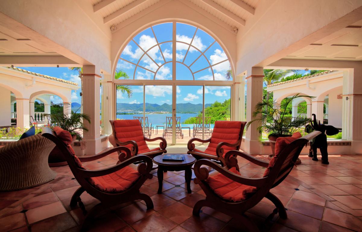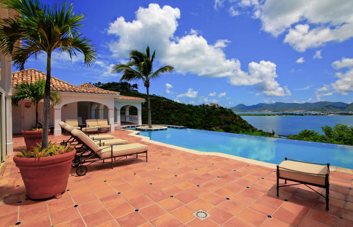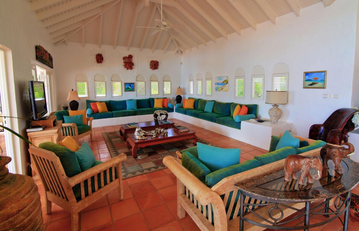 Interior spaces include a spacious comfortable living room with lots of cushioned seating and a large TV with Dish Satellite and DVD. Plus there is smaller air conditioned office with computer, cozy seating and another TV. The entire back of the villa opens through glass and glass doors to the infinity- edge pool and the water view. There is formal dining for 8, a sunny breakfast table and bar for as many as 12 and 2 separate conversation areas for at least 4 each.