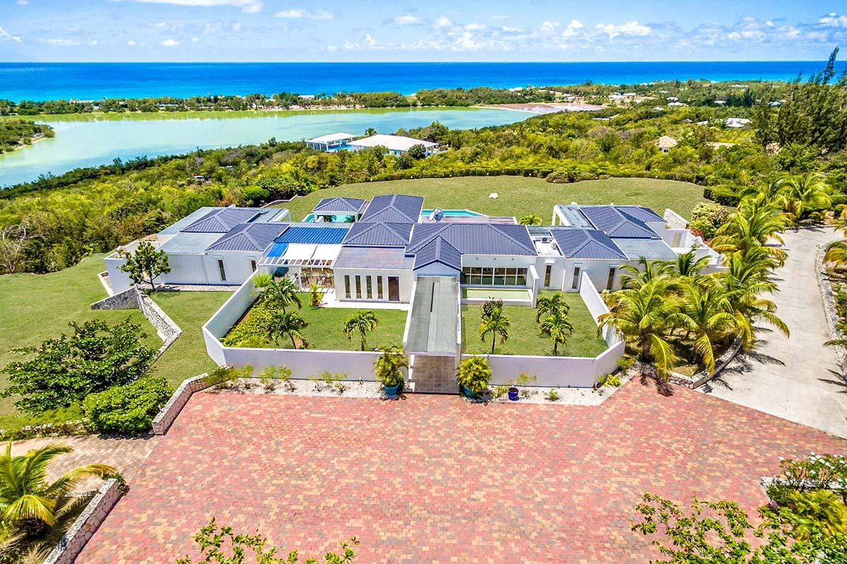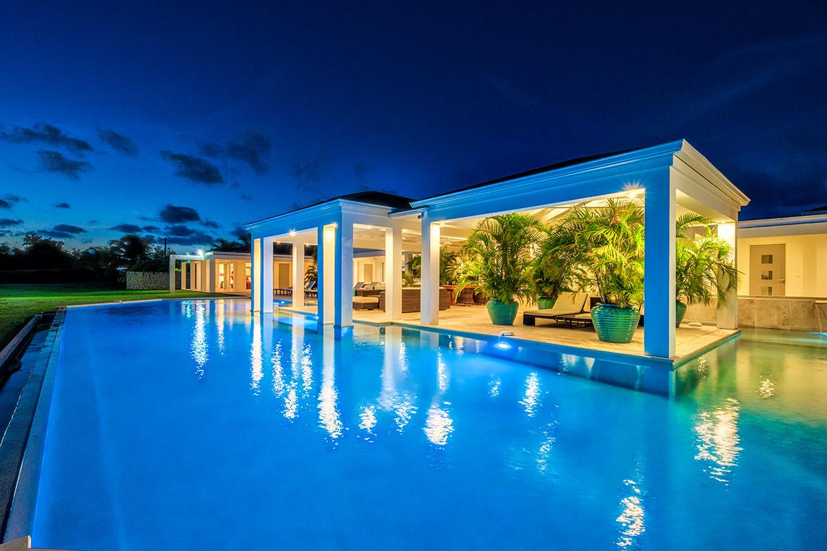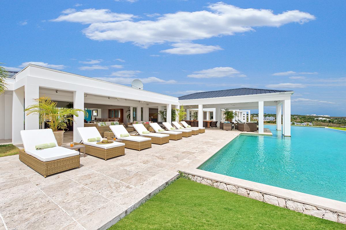This extraordinary estate style villa enchants the moment you enter the gate. The long, palm-lined drive brings you to a large private courtyard and garden. Beyond the front door is a stunning house and one of the most dazzling oceans views on island. Panoramic vistas flow from every room and terrace. The colors are magical. An expansive stretch of sapphire sea is framed by the villa’s gardens and the rich blue sky. The large contoured pool edges overlap the lawn adding crystal blue tones to the scene.